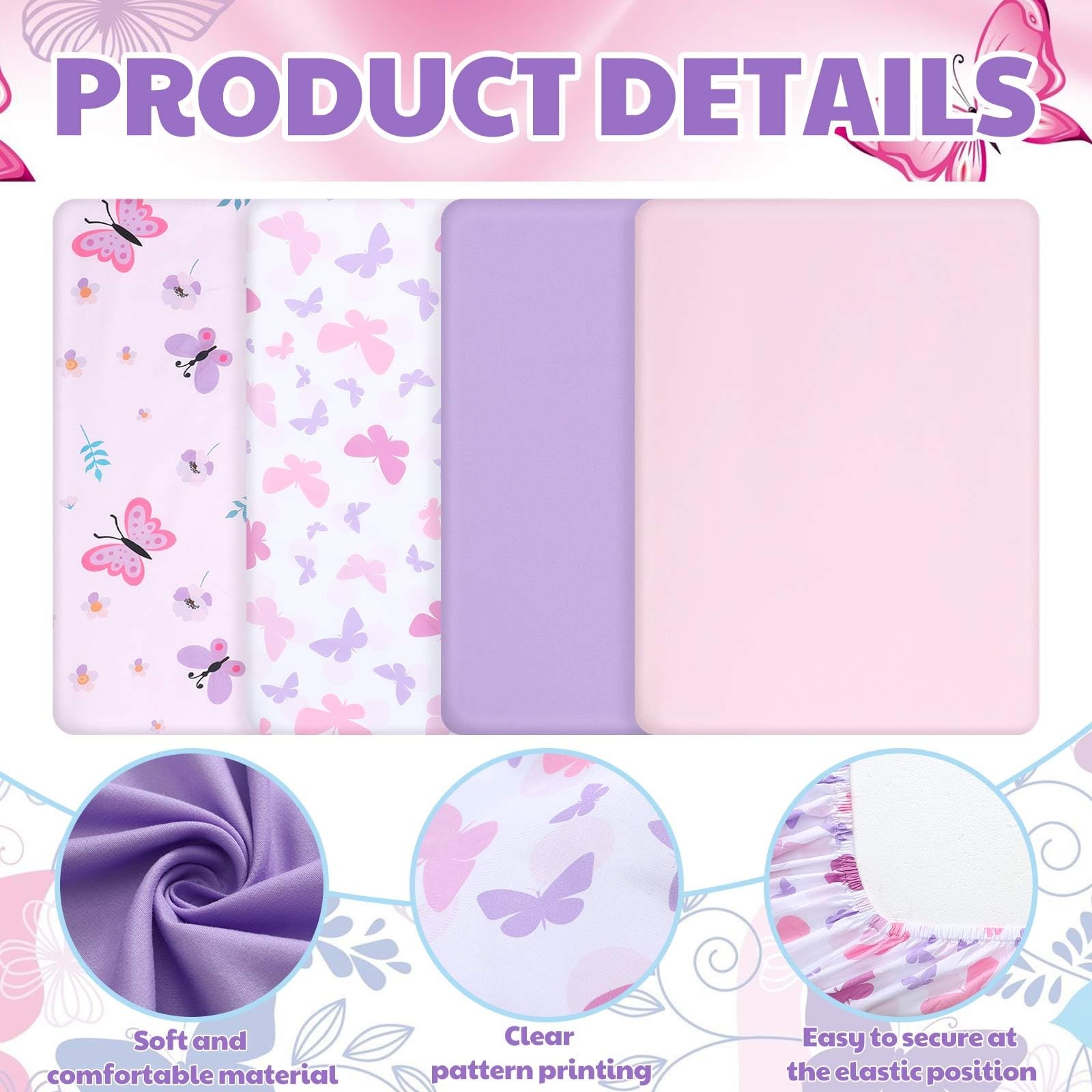 4 Pack Butterfly Baby Crib Set for Girls Standard Size Crib Mattresses Soft B...