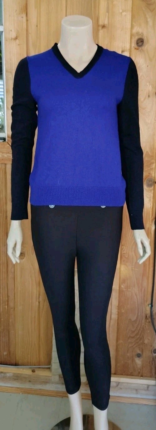 как выглядит EXPRESS Fino Merino Wool Sweater V-Neck Royal Blue W/ Black Pullover Size S/P фото