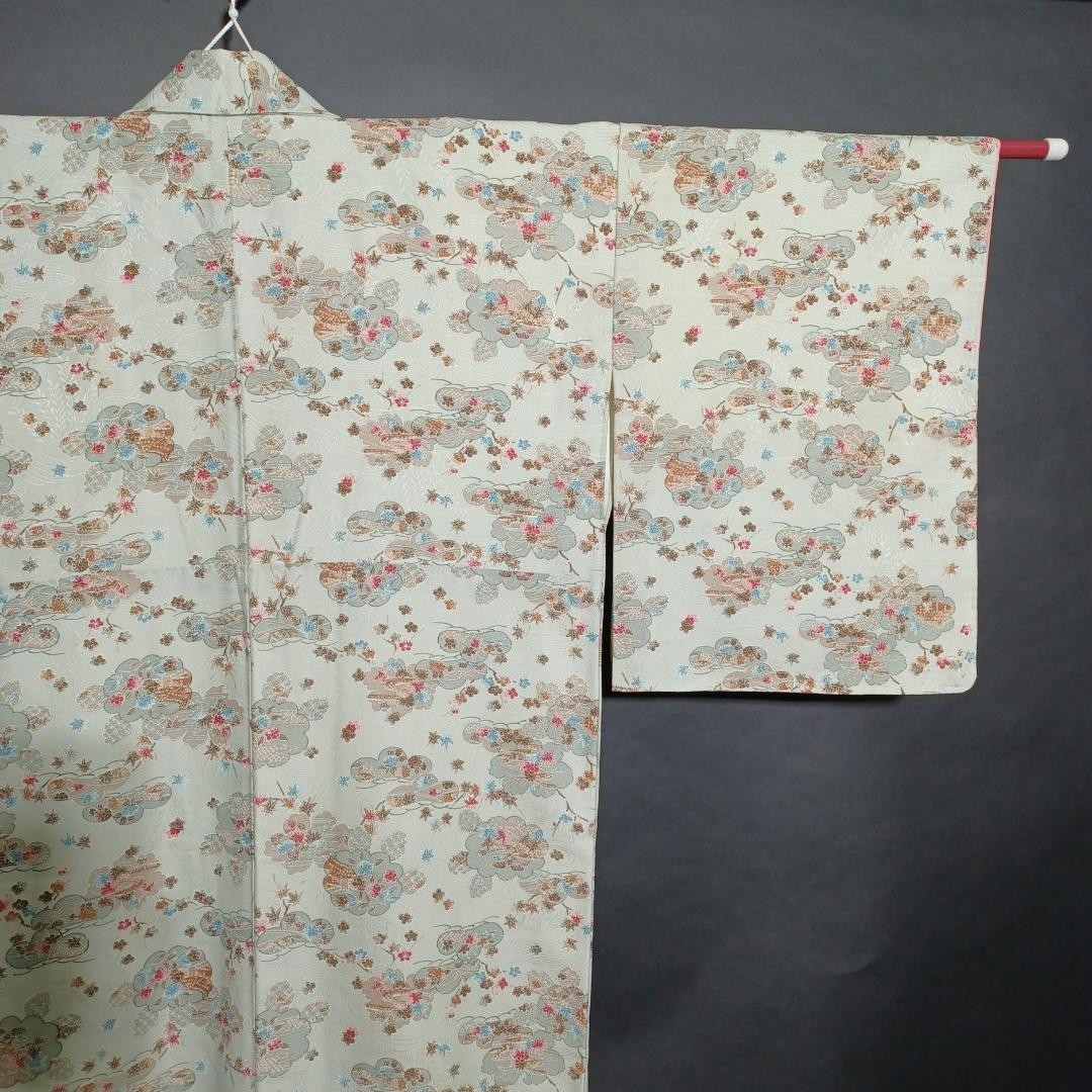 • Used Japanese Vintage Kimono Pale Green Floral Pattern Traditional Silk Robe 61i