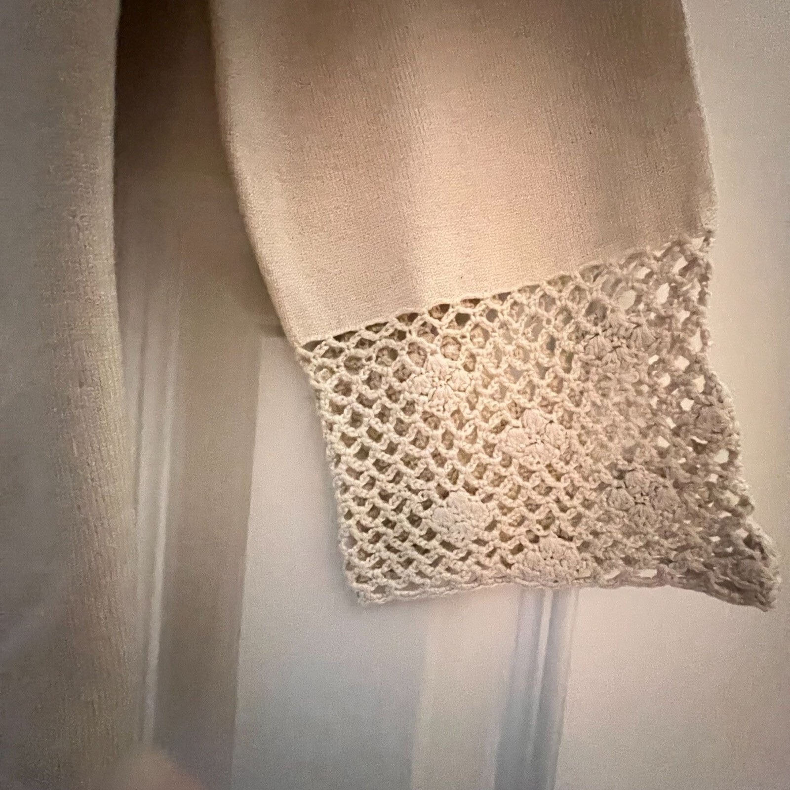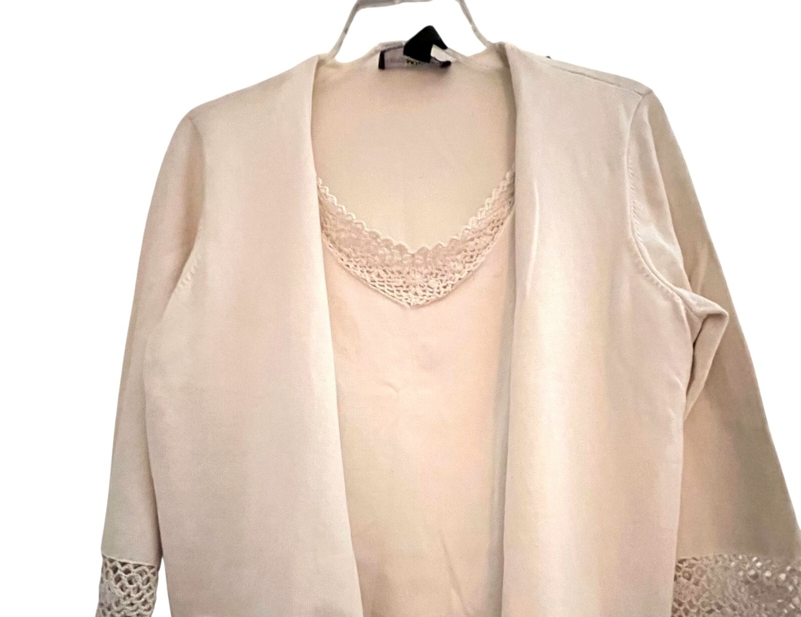 как выглядит NWT Norton McNaughton Ivory Cardigan Silk Crochet Trim Lace Front Panel PM фото