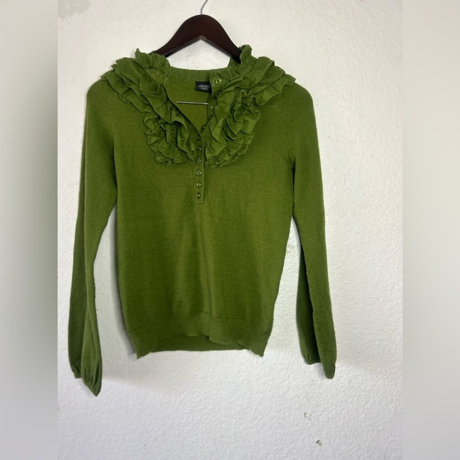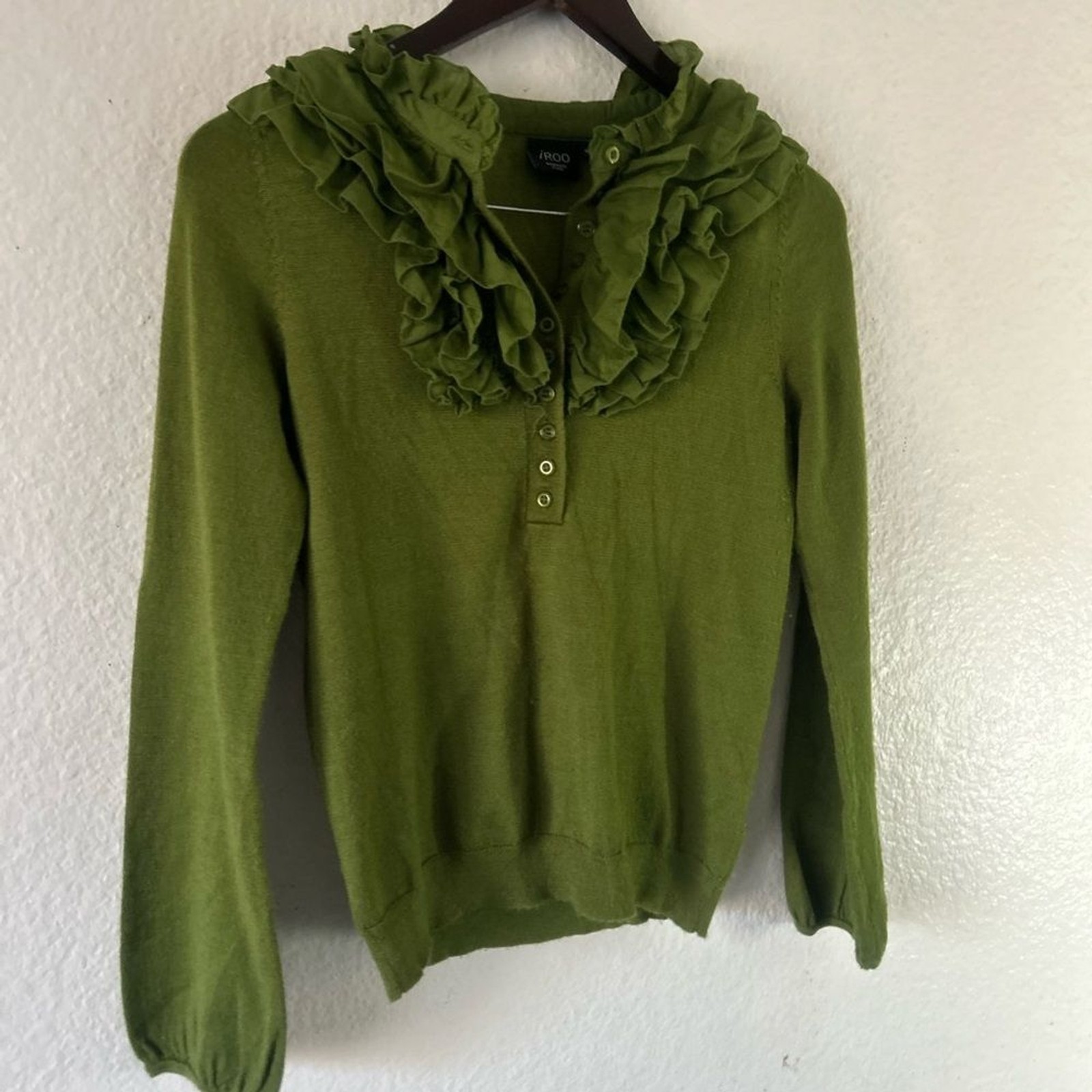 IROO Olive Ruffled Crew Neck Button Sweater Wool Blend M Italian Artsy