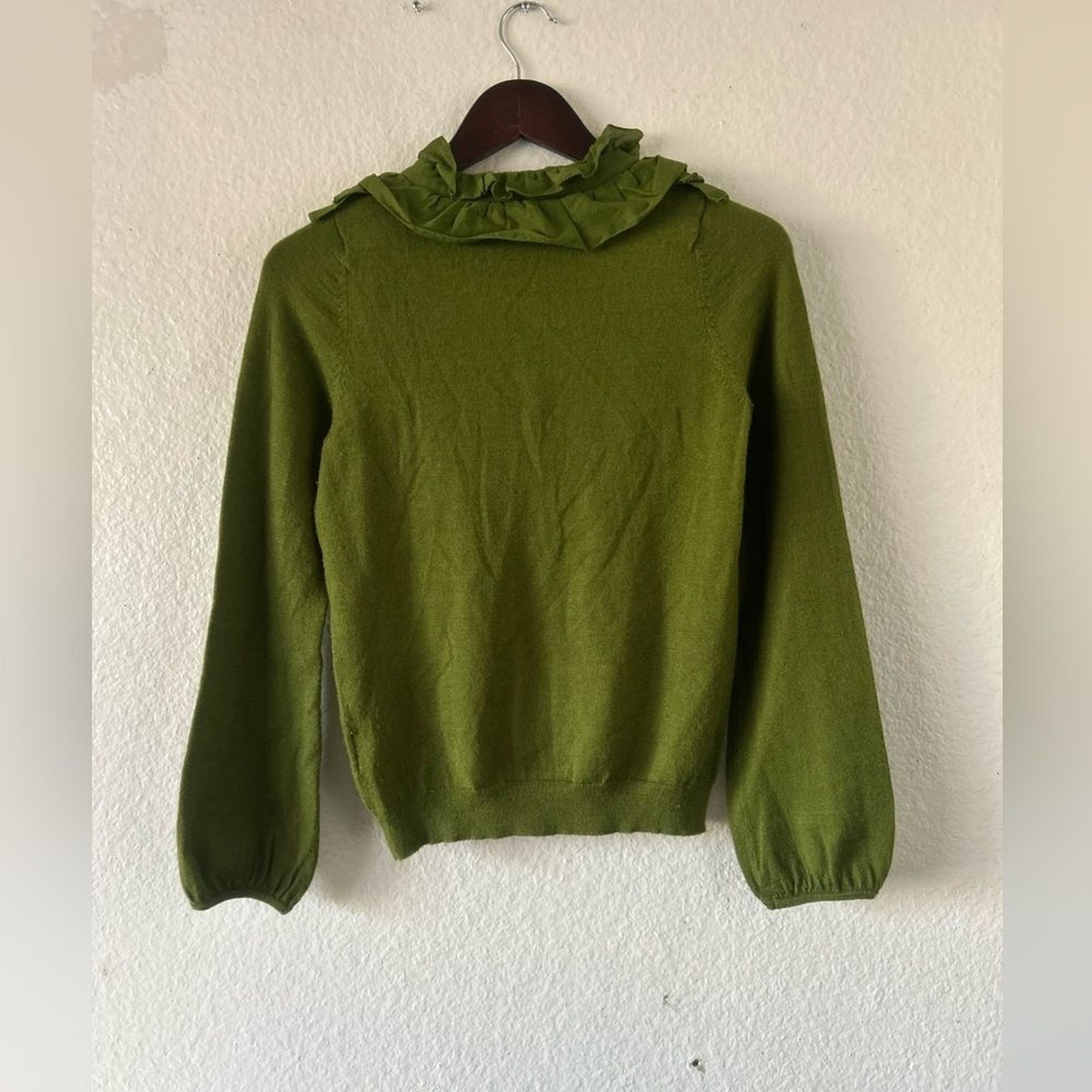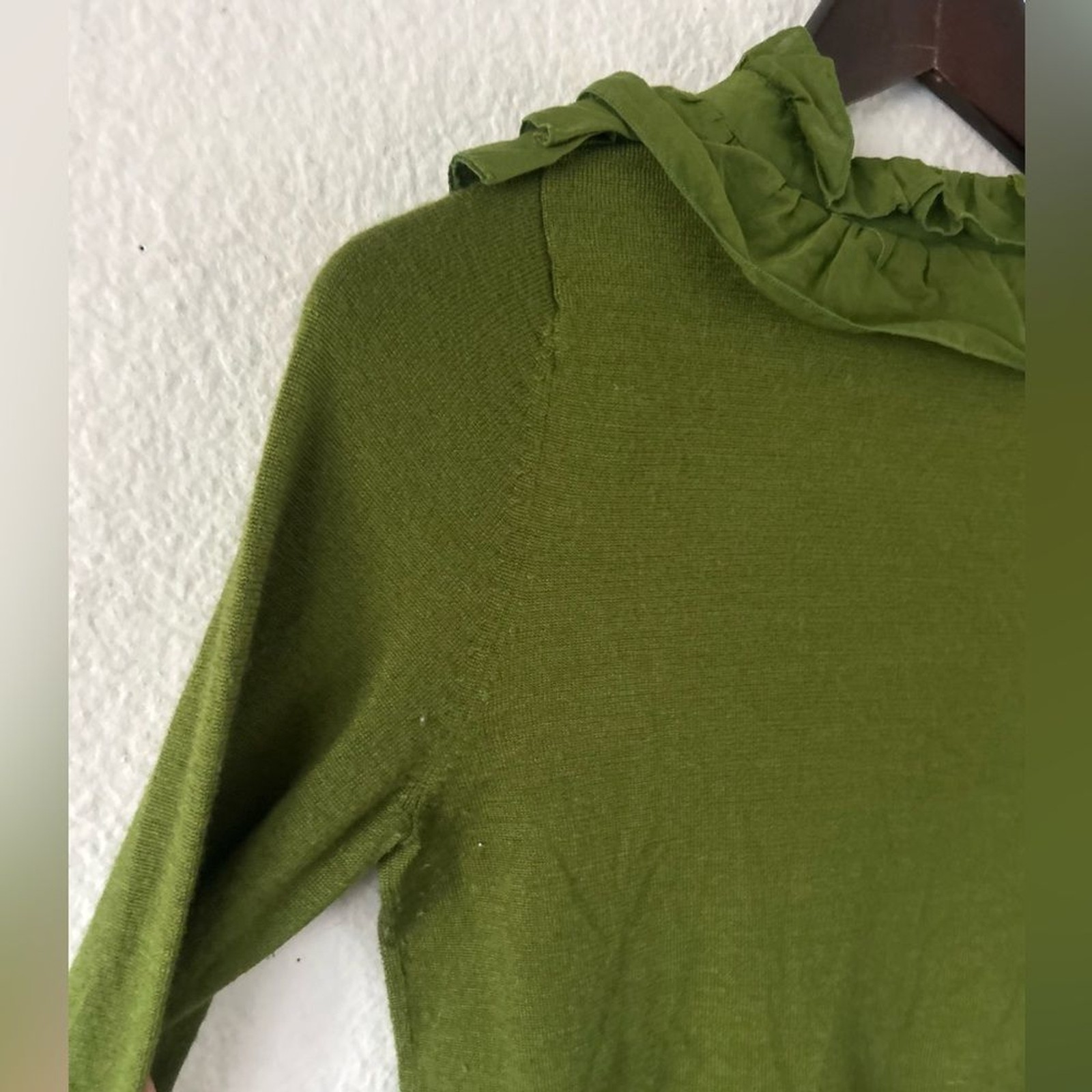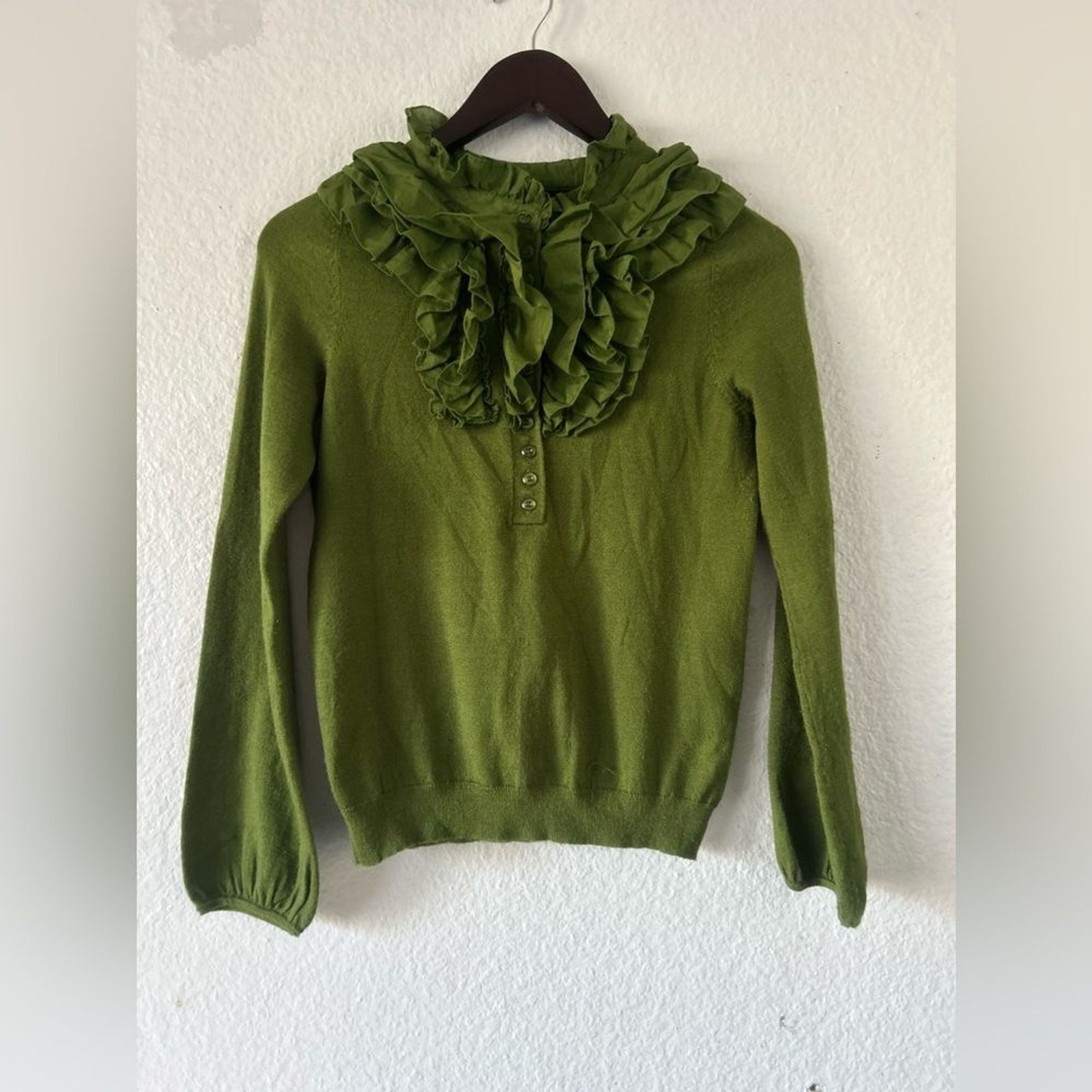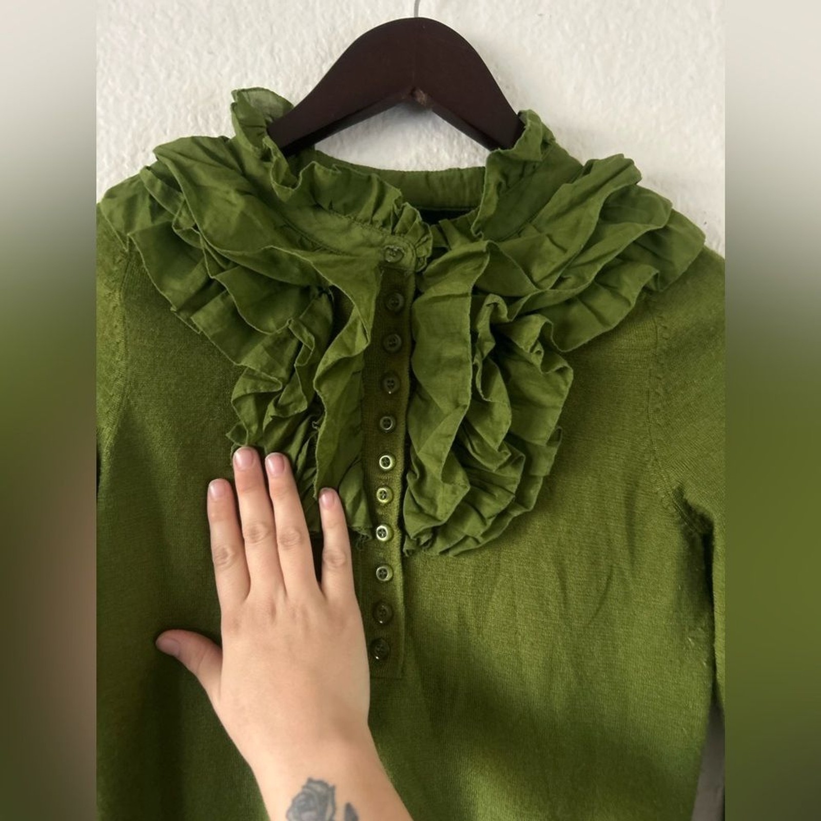 как выглядит IROO Olive Ruffled Crew Neck Button Sweater Wool Blend M Italian Artsy фото
