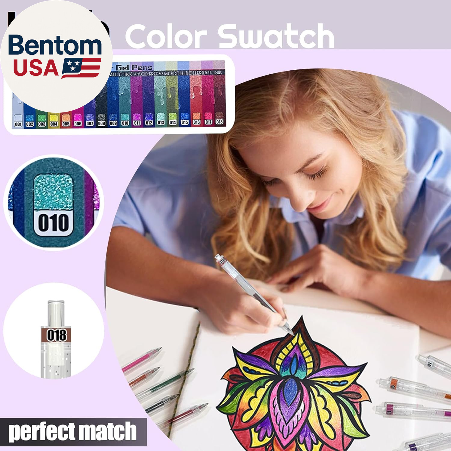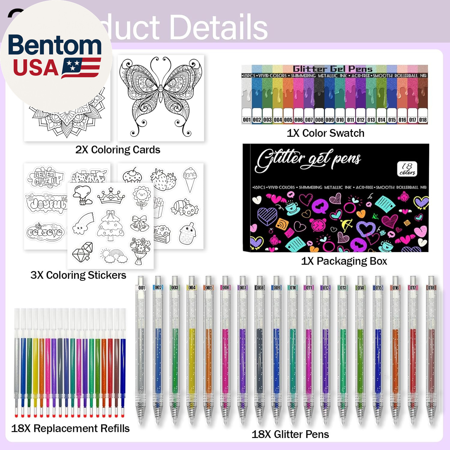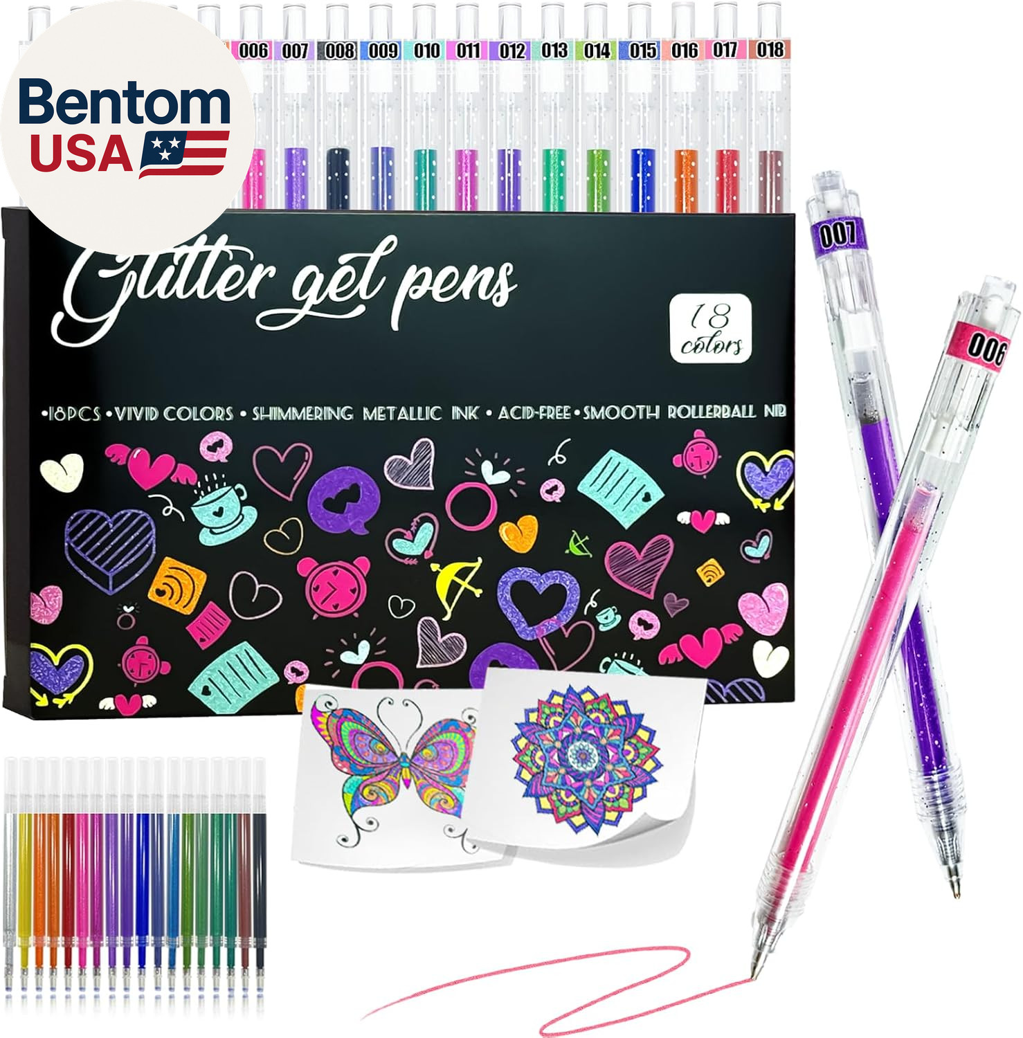 Glitter Pens 18 Colors with 18 Refills, Retractable Glitter Gel Pens for Adult,