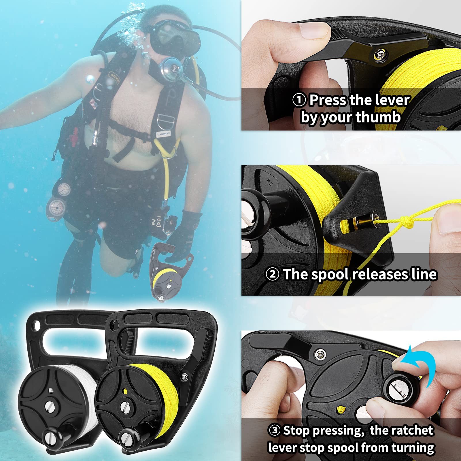 Diving Reel with Thumb Stopper, Heavy Duty 46m/150ft Yellow Line SMB Scuba Ra...