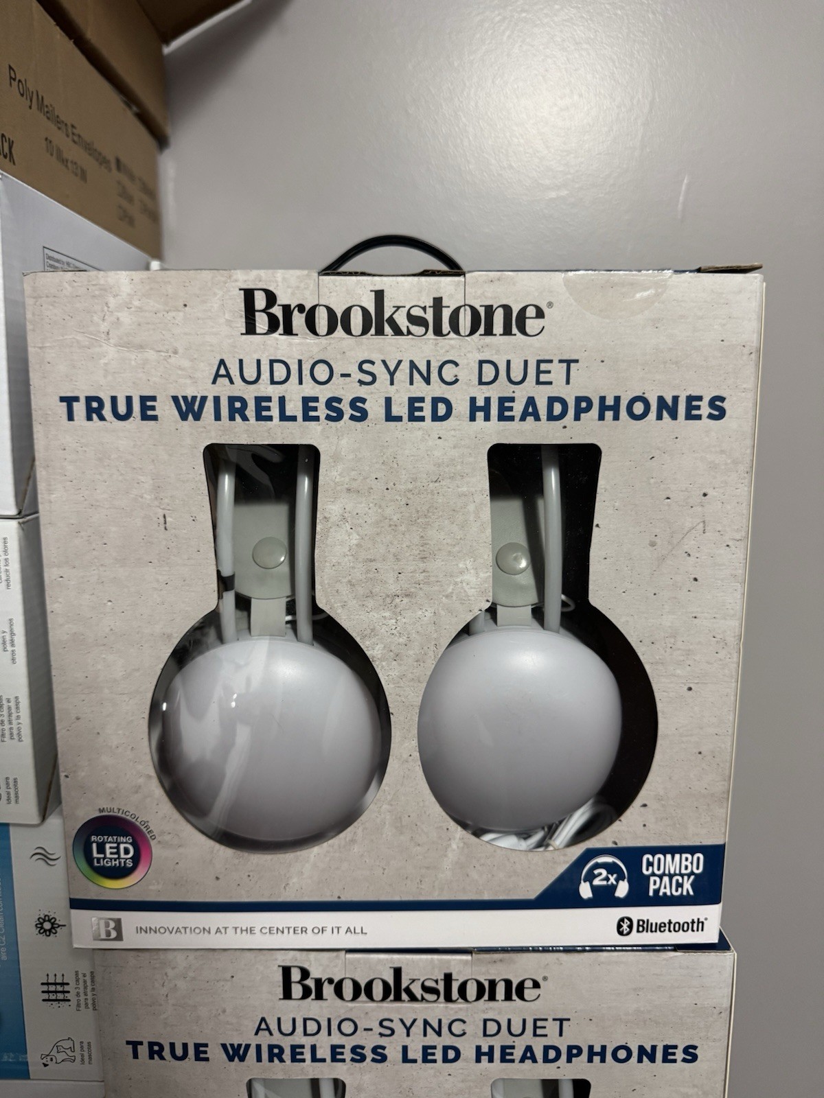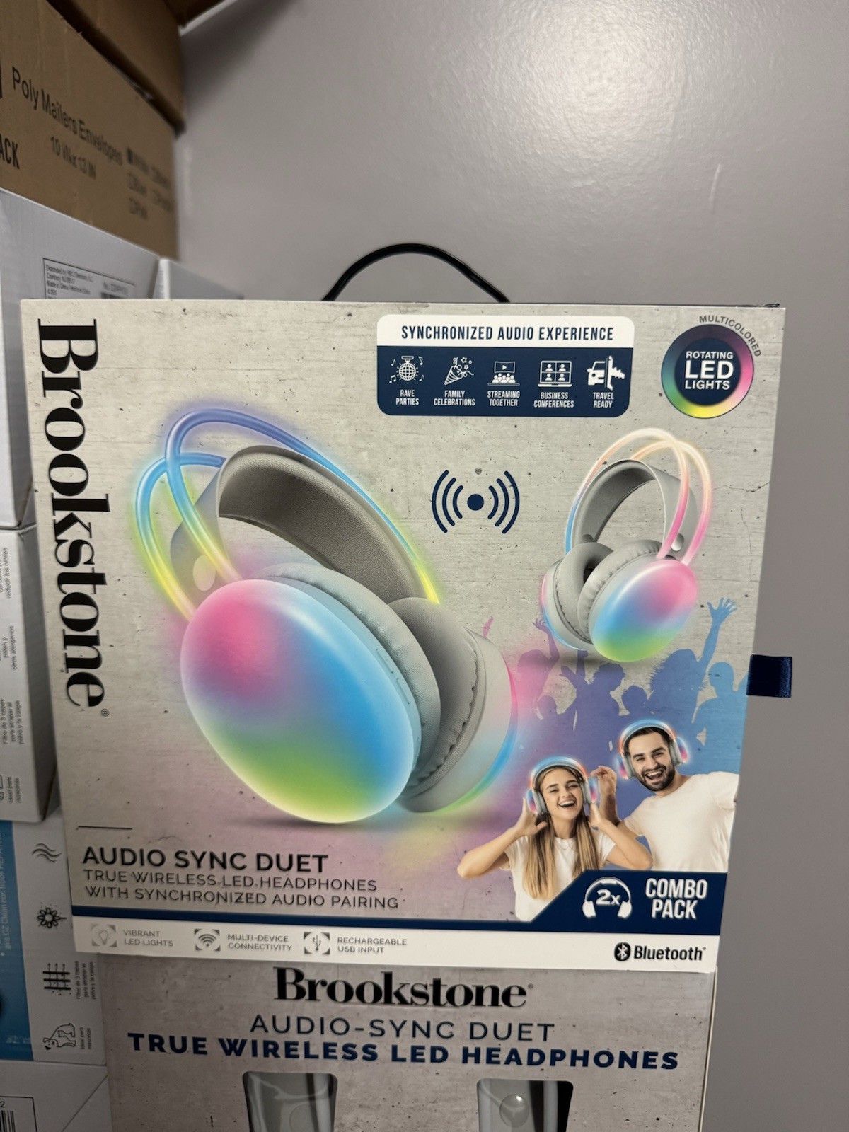 как выглядит Brookstone Audio Sync Duet 2-Pack Wireless Bluetooth Headphones Multicolored LED фото