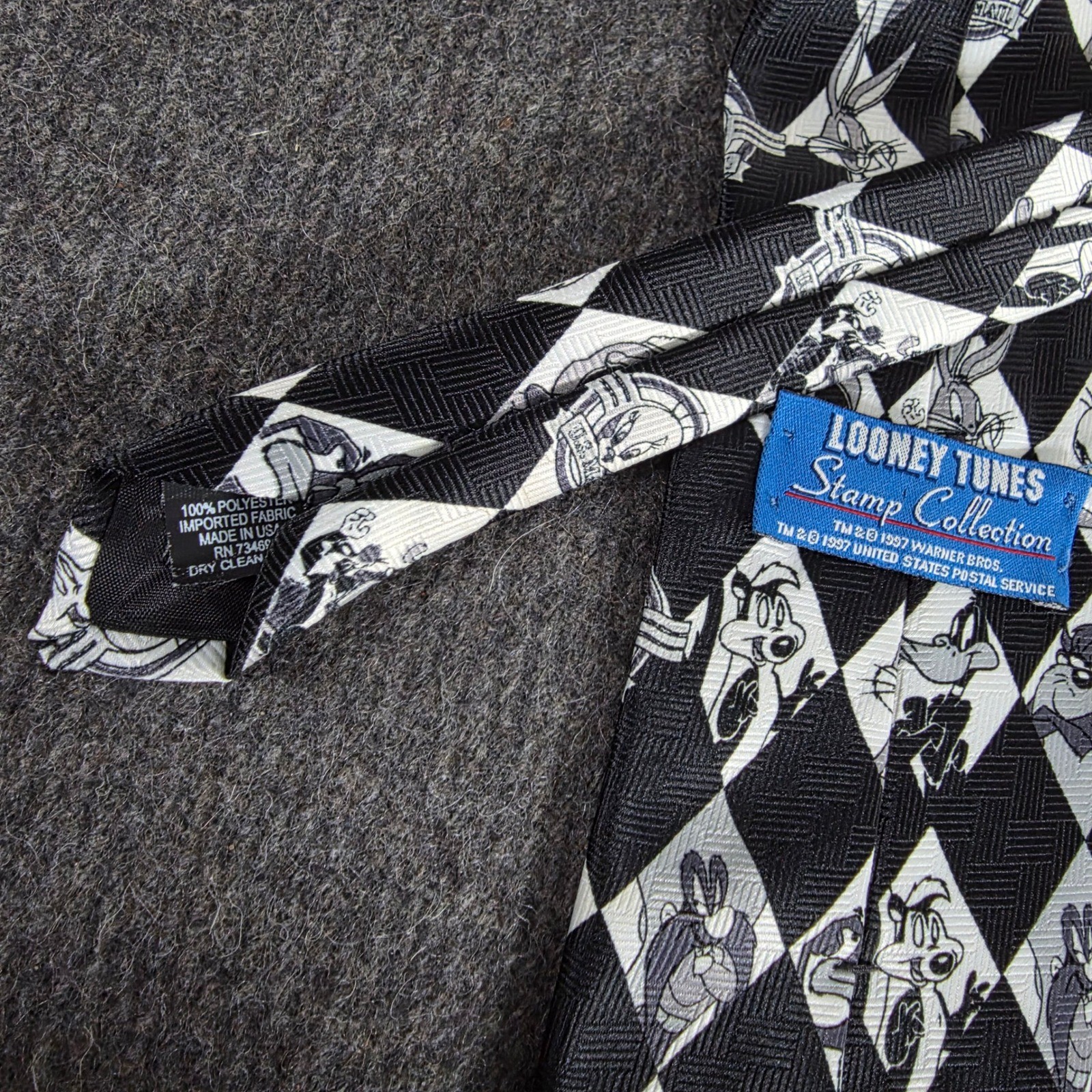 как выглядит Vintage 1997 Looney Tunes Stamp Collection USPS Mens Tie Black White Argyle 90s фото
