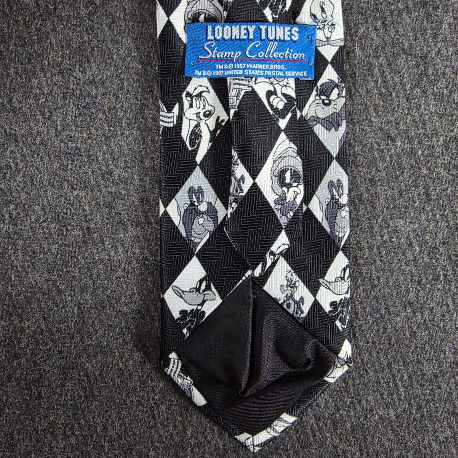 Vintage 1997 Looney Tunes Stamp Collection USPS Mens Tie Black White Argyle 90s