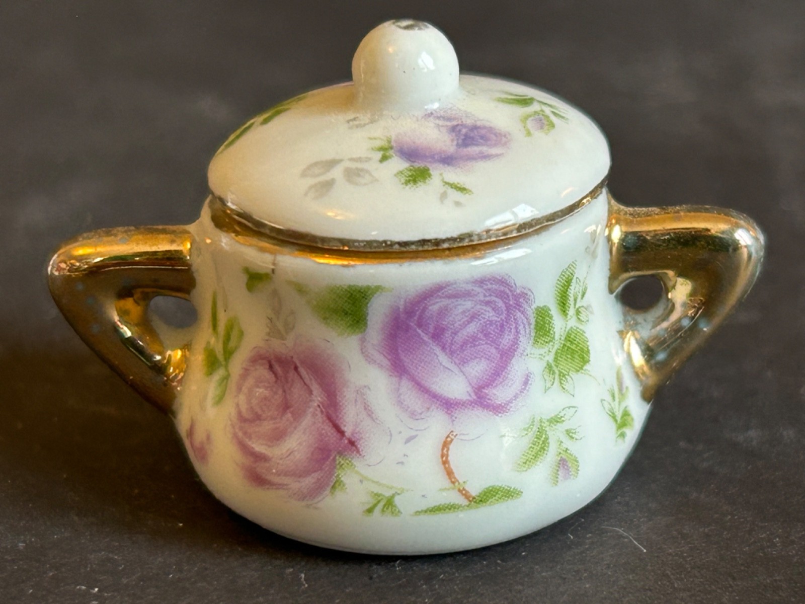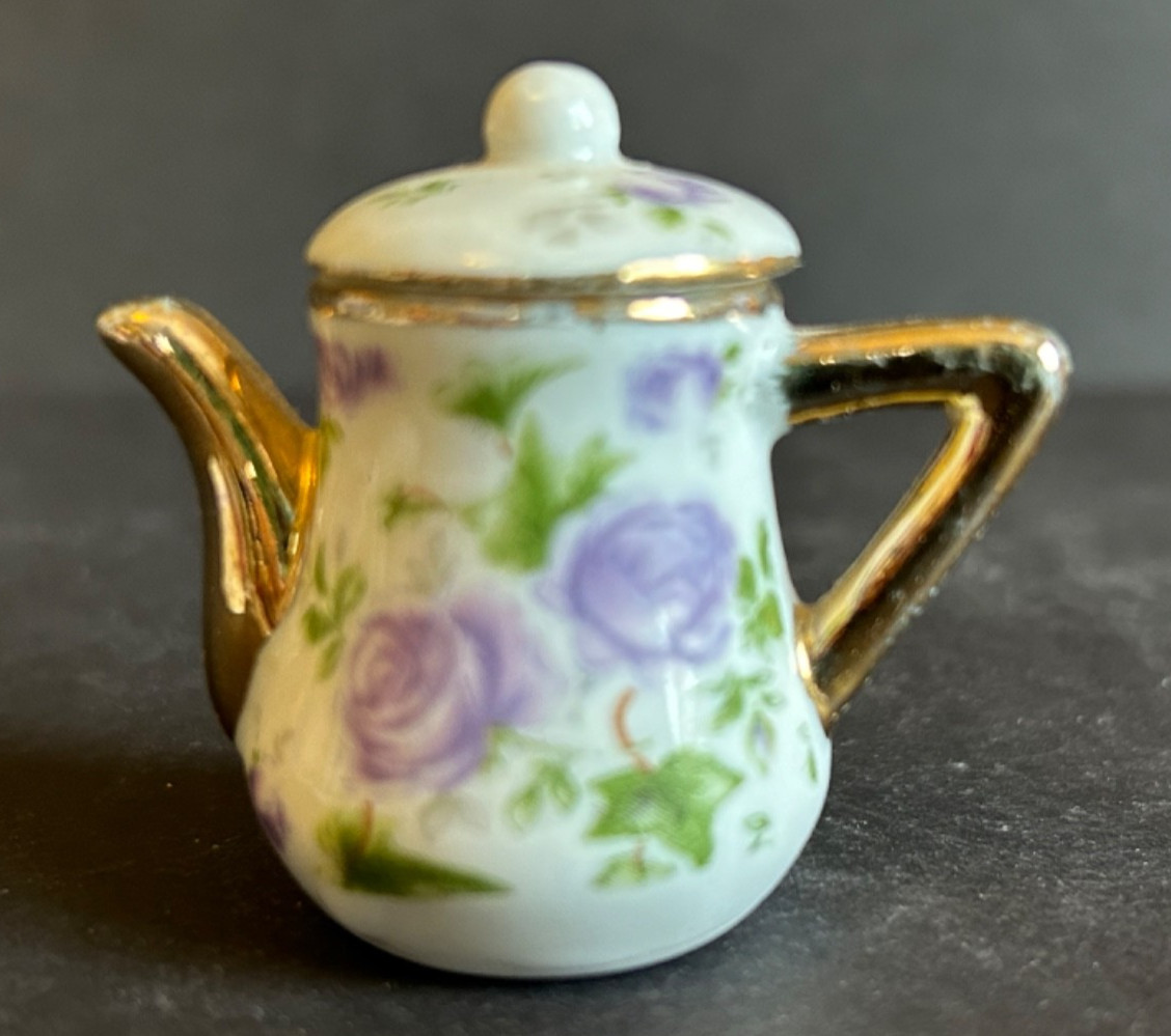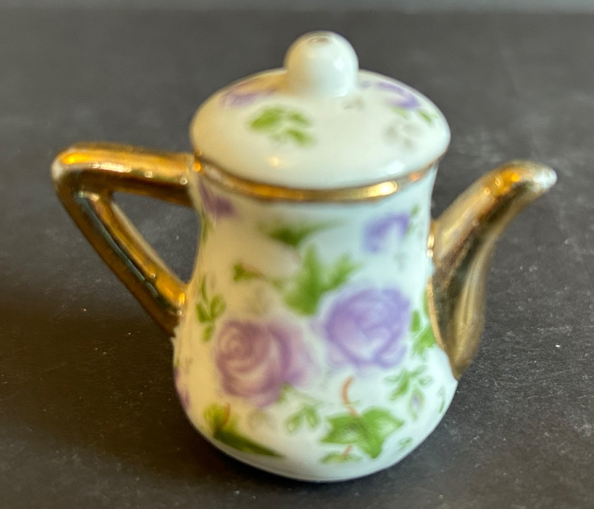 • Miniature Tea Set White Background Purple Rose Floral With Gold Trim 8 Piece VTG