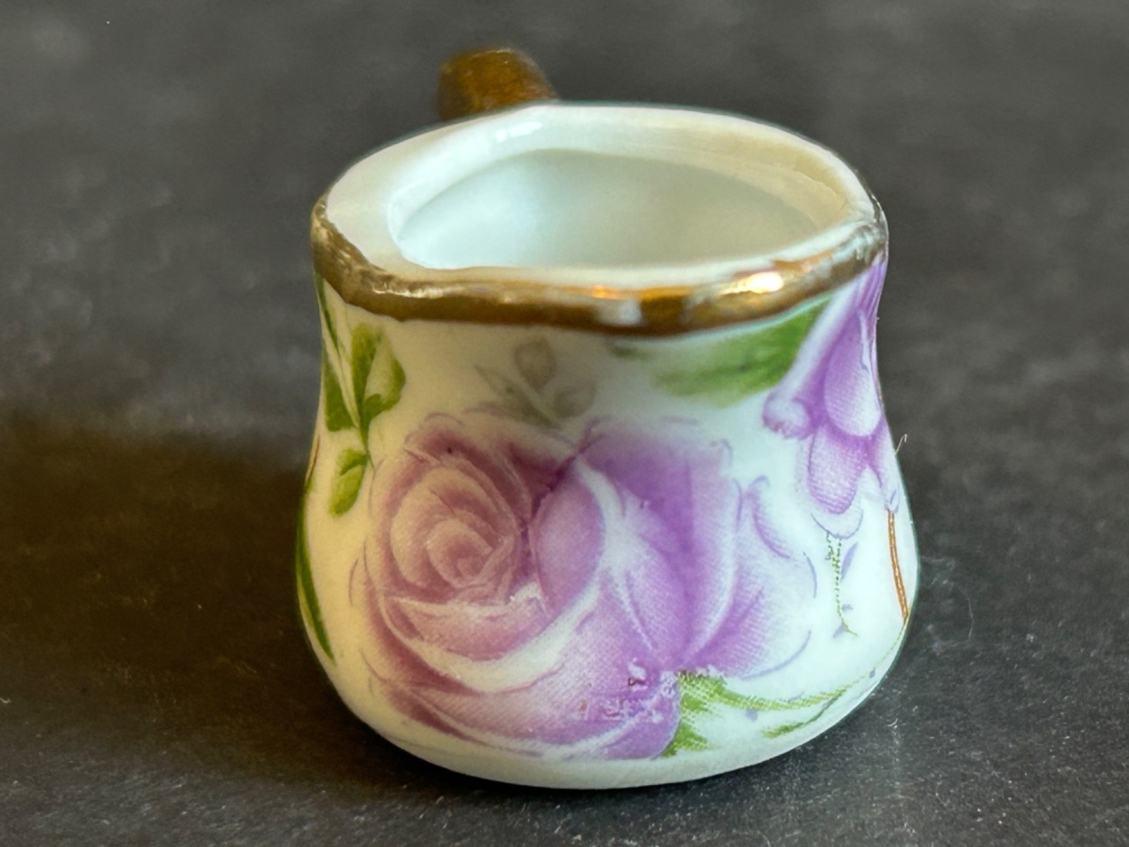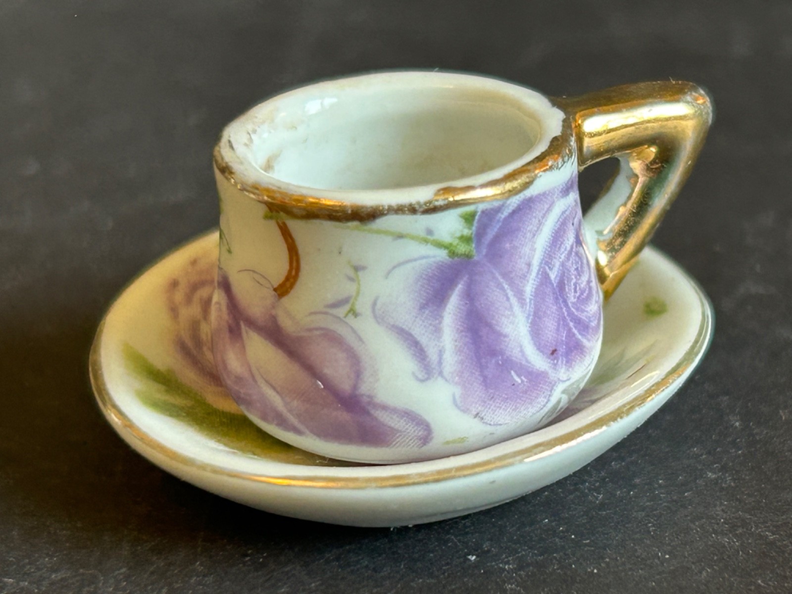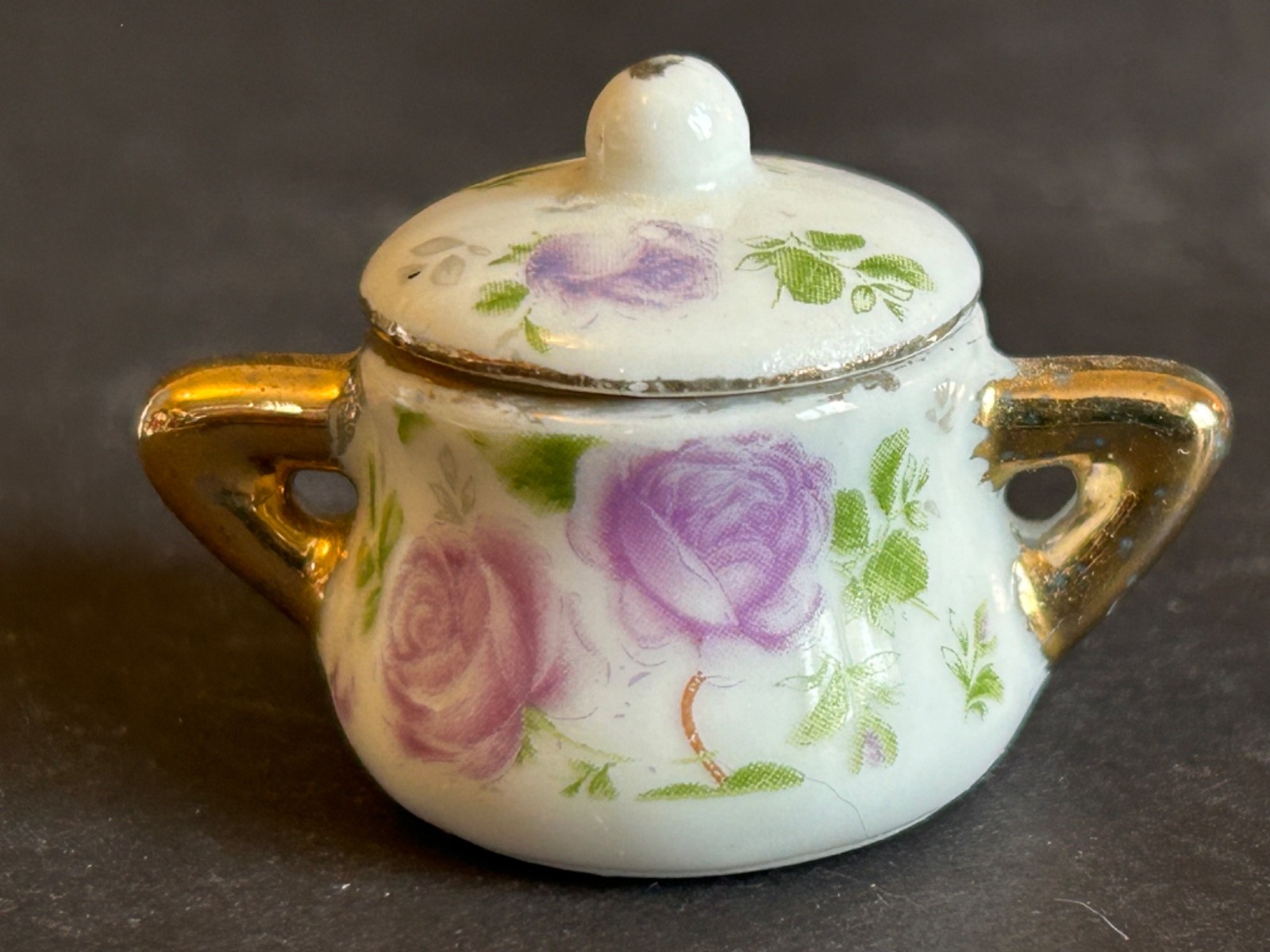 • Miniature Tea Set White Background Purple Rose Floral With Gold Trim 8 Piece VTG