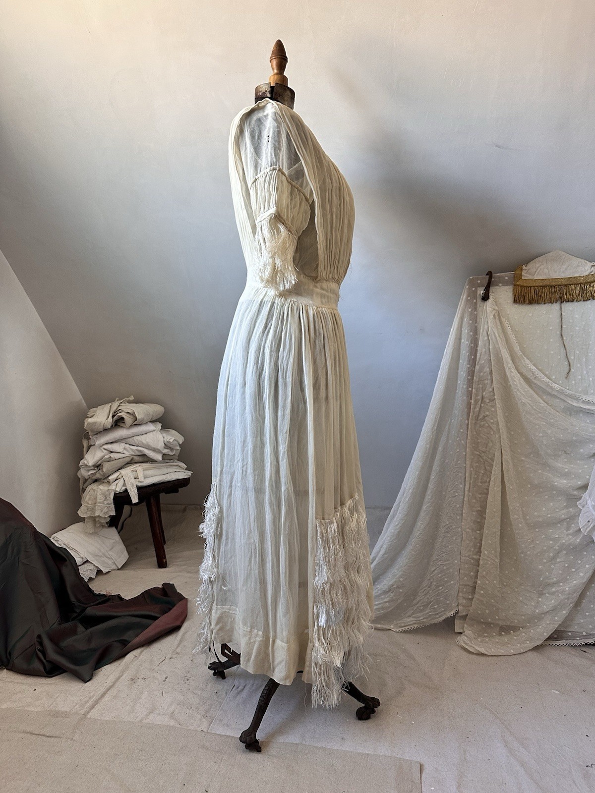 Antique Edwardian 1900s Sheer Cream Ivory Silk Wedding Dress Fringe Womens Small
