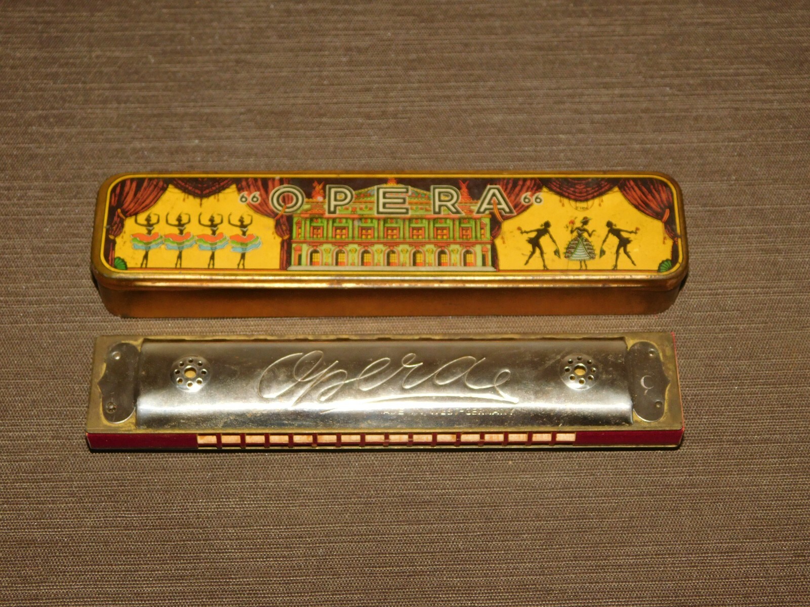 VINTAGE MUSIC 6 1/4 LONG OPERA HARMONICA WEST GERMANY IN TIN BOX