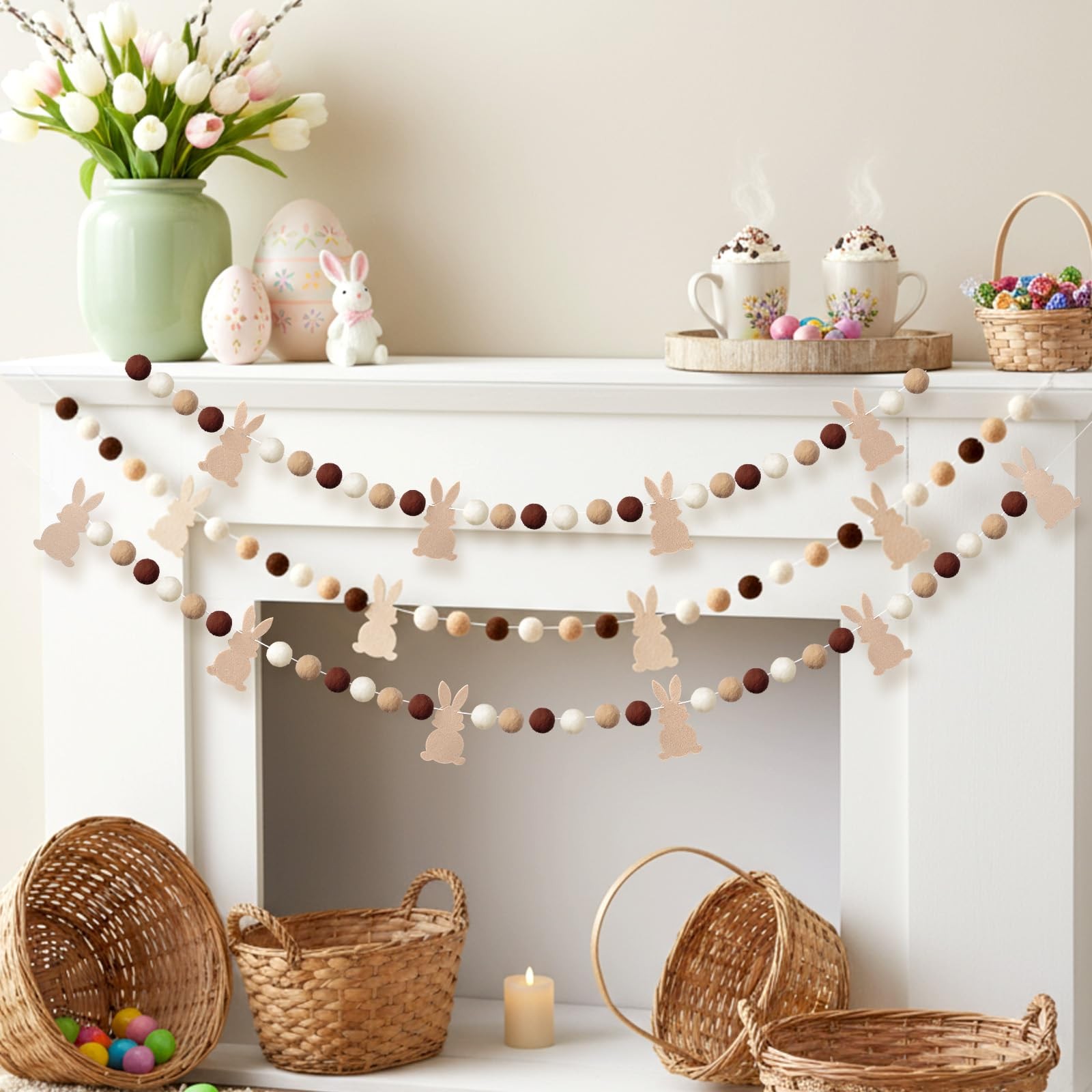 3 Pcs Natural Easter Felt Pom Pom Ball Garland Rustic Easter Bunny Banner Decora