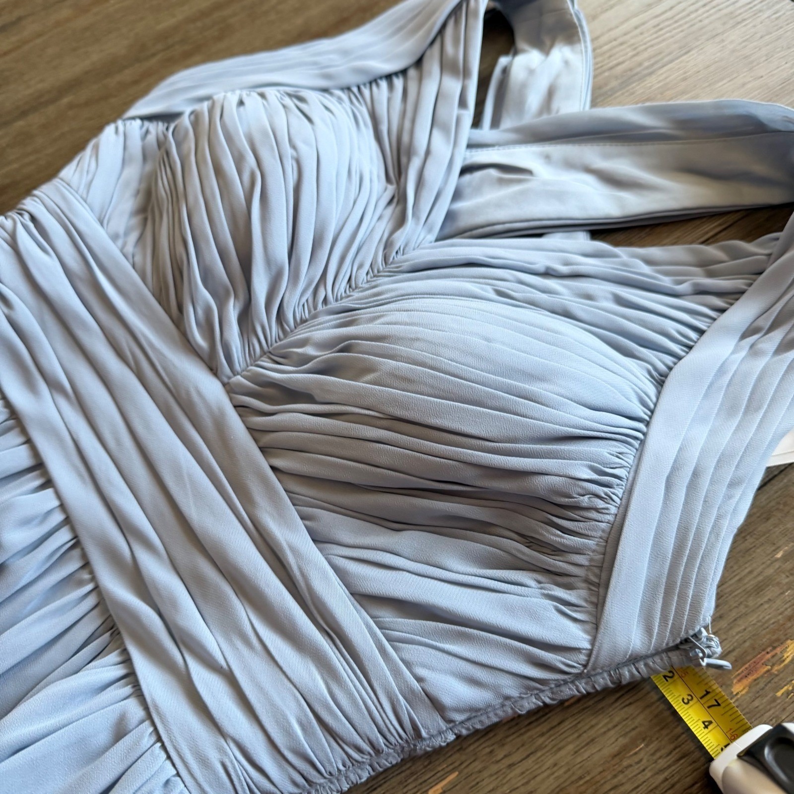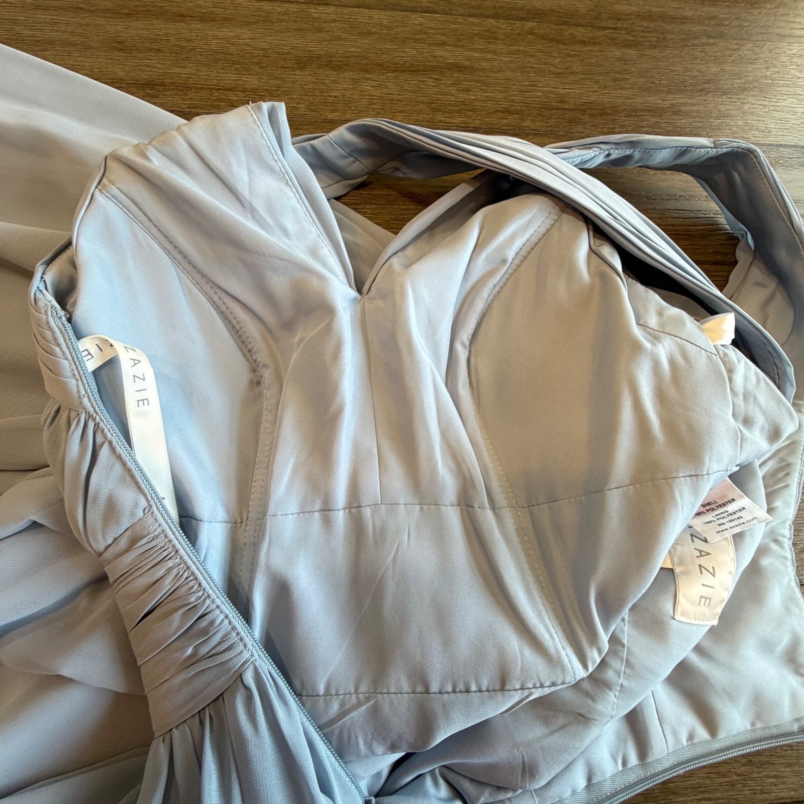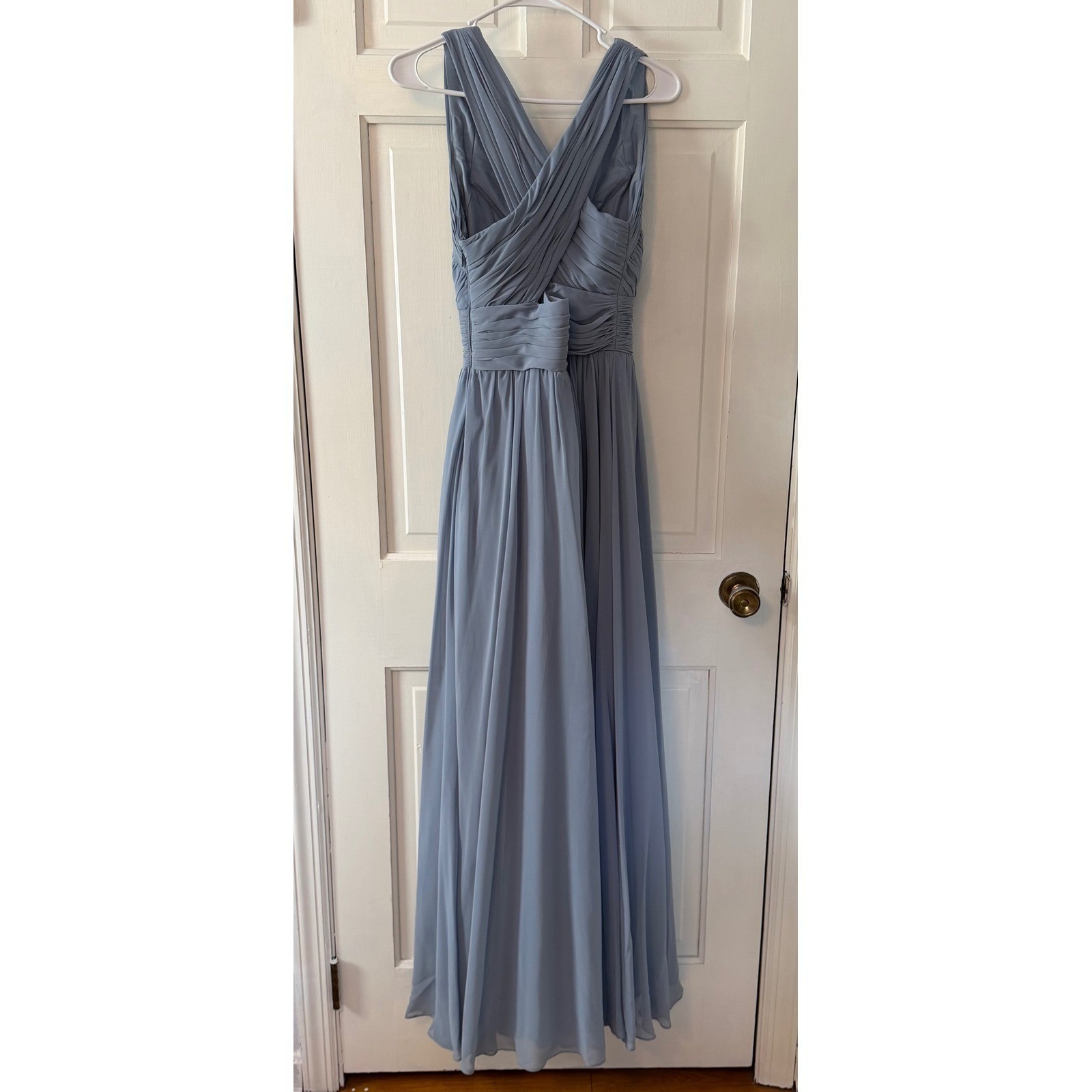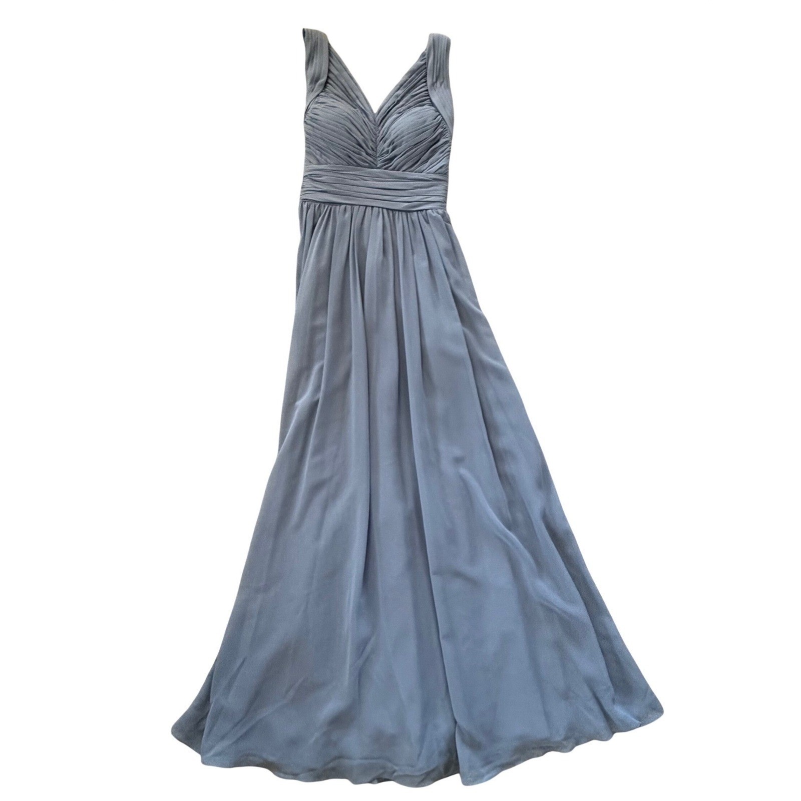 как выглядит Azazie Dusty Blue Chiffon Maxi Bridesmaid Dress A4 Ruched V-Neck Criss-Cross фото