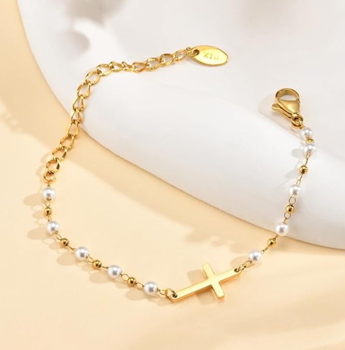 • Christian Pearl Cross Bracelet Kids First Communion Baptism Gift