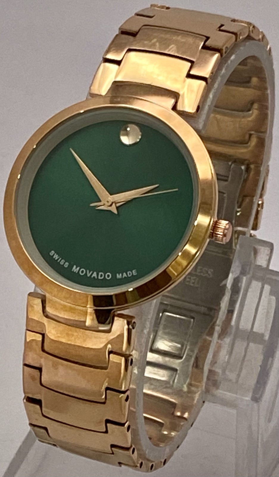как выглядит Refurbished Rare Rose-Gold Tone Movado Slim Green Dial Women