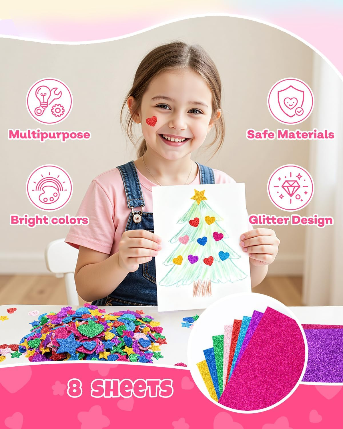 1024PCS Glitter Foam Stickers for Kids - Self-Adhesive Heart Star Shapes, Spar