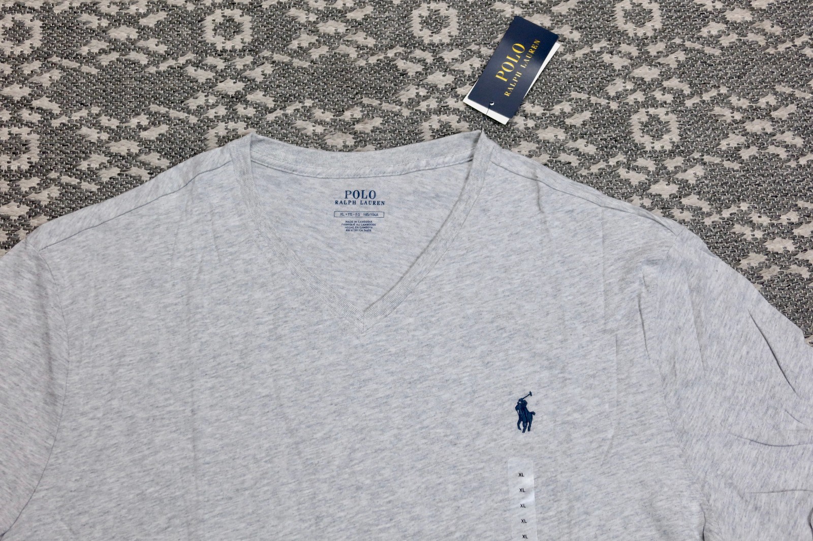 как выглядит New Polo Ralph Lauren Mens V-Neck Tee T-Shirt - Size XL - Gray with Blue Logo фото
