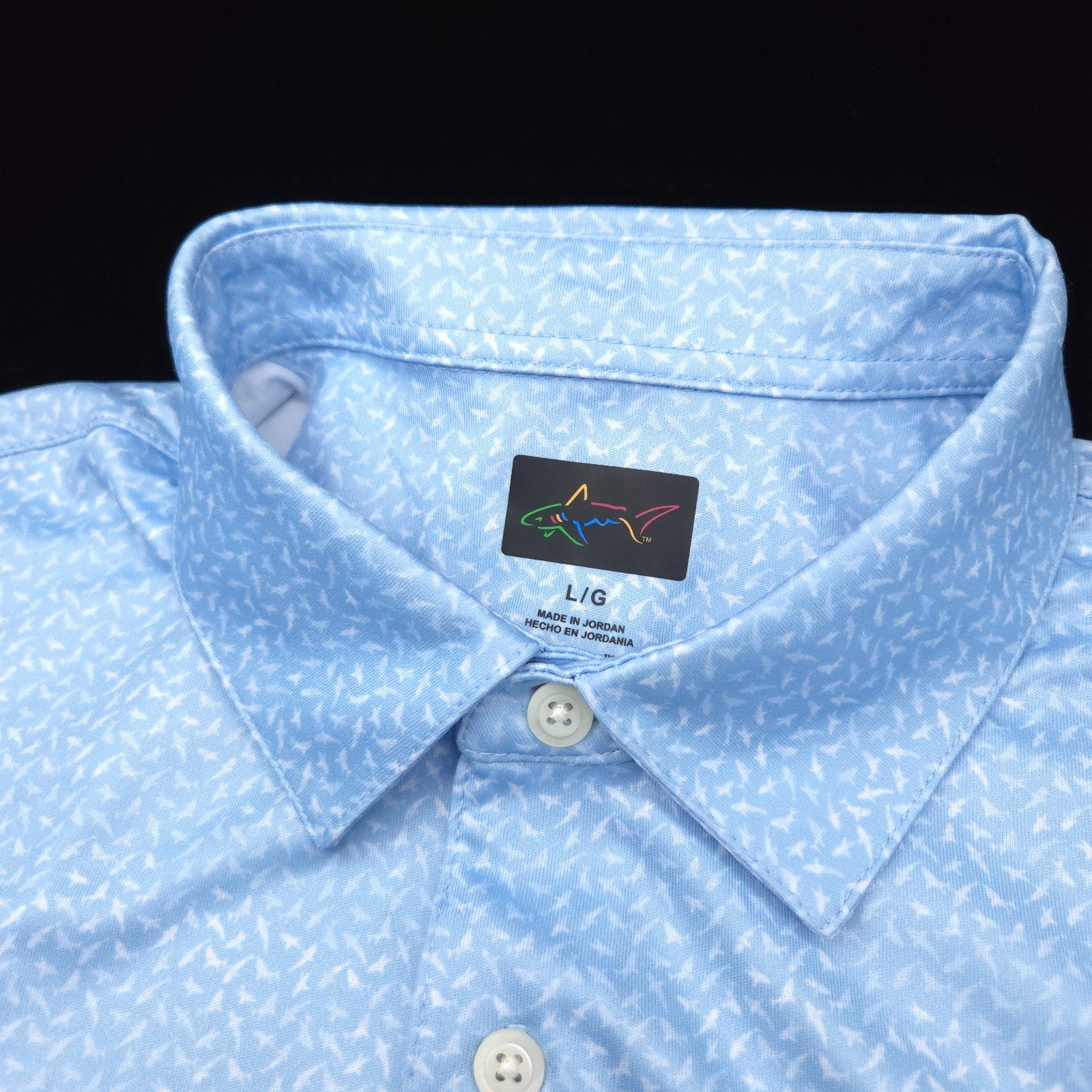 NEW GREG NORMAN GOLF POLO SHIRT -L- BLUE WHITE DOT SHARK Poly Soft PERFORMANCE