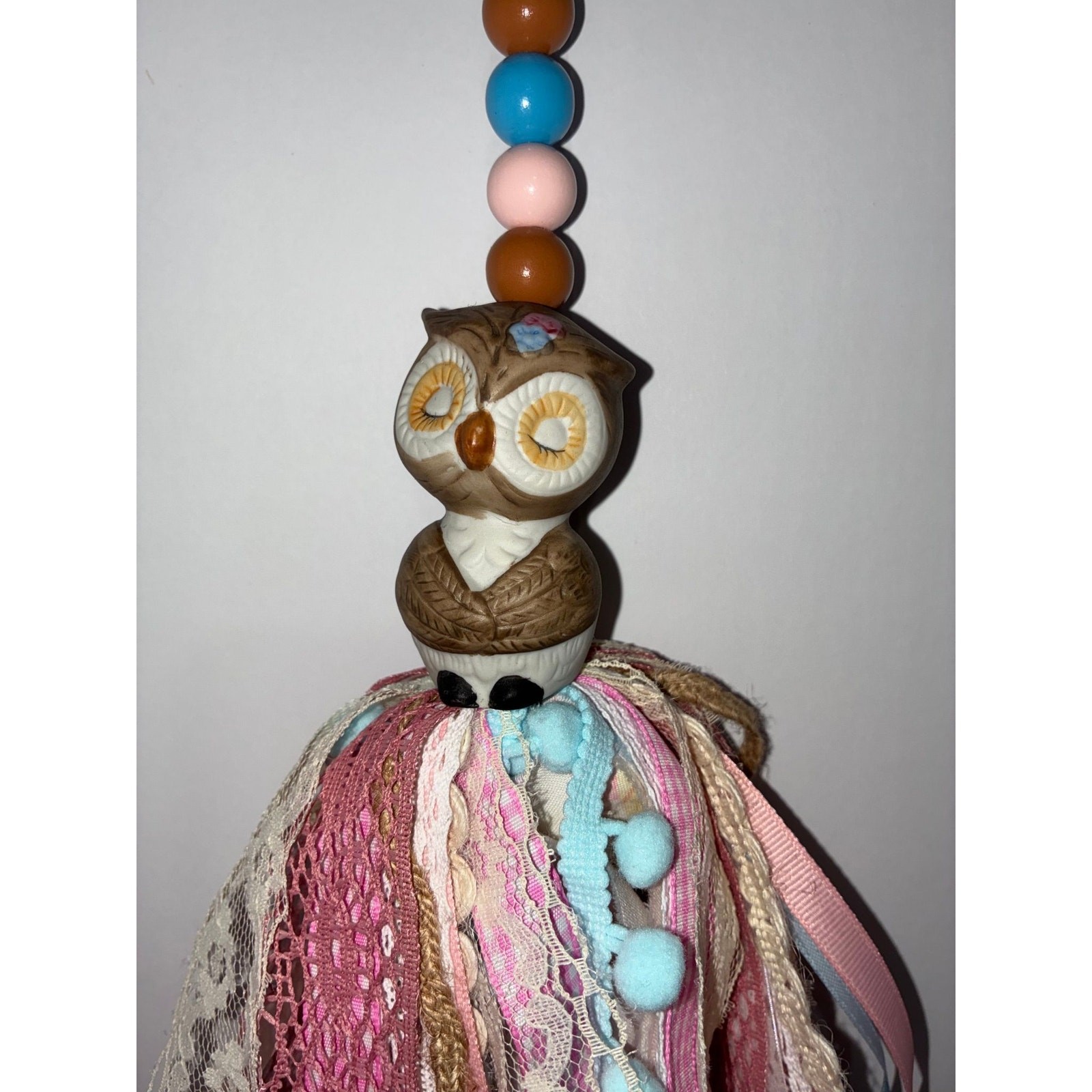Vintage Salt Shaker Tassel Charm Handmade Lace Ribbon Boho Cottage Decor Owl Top