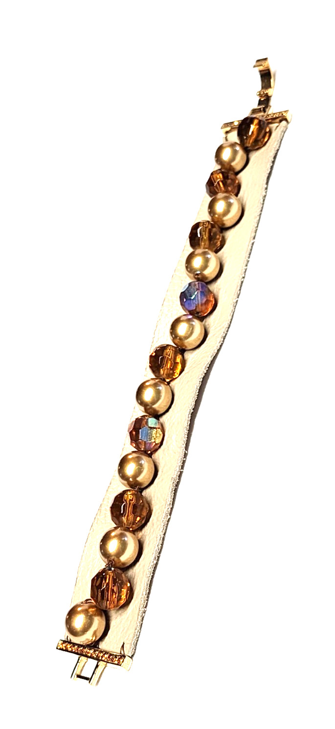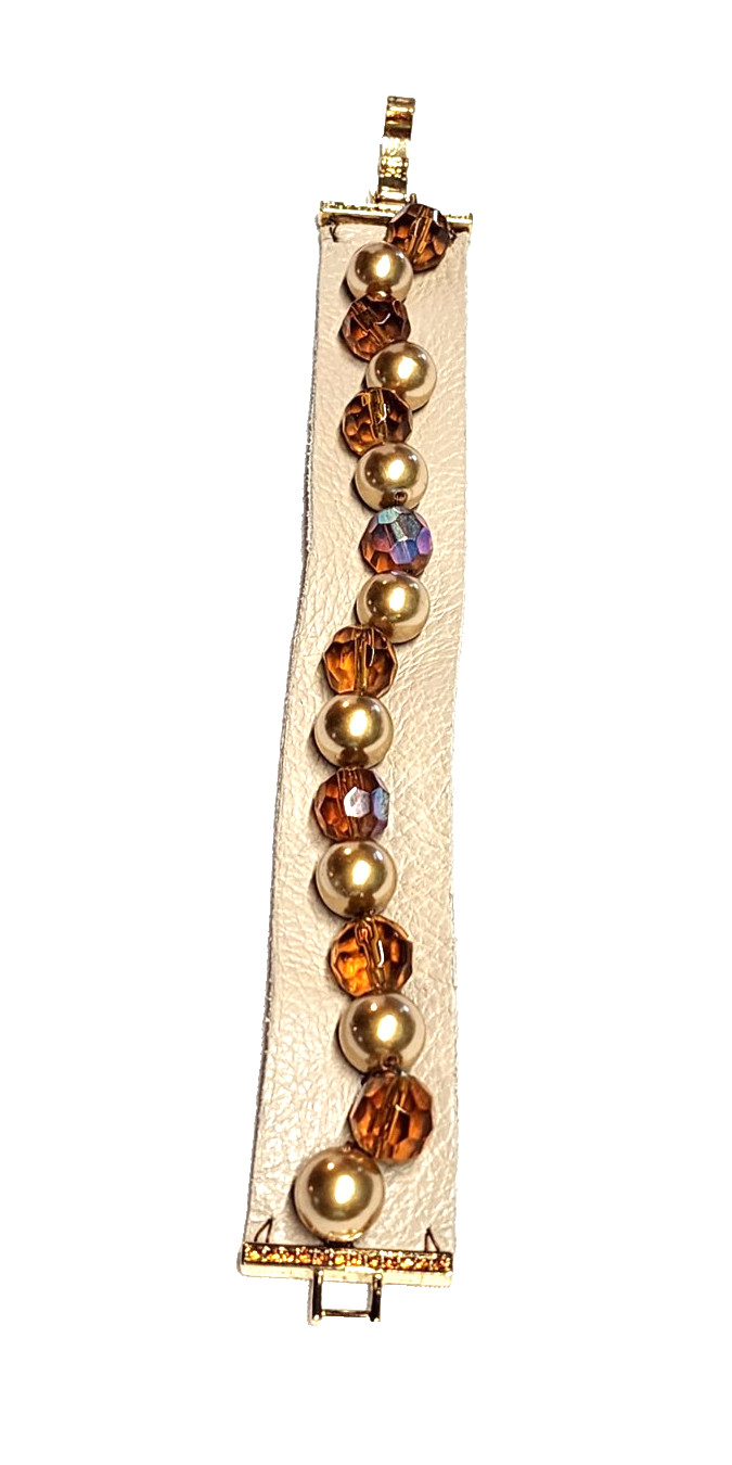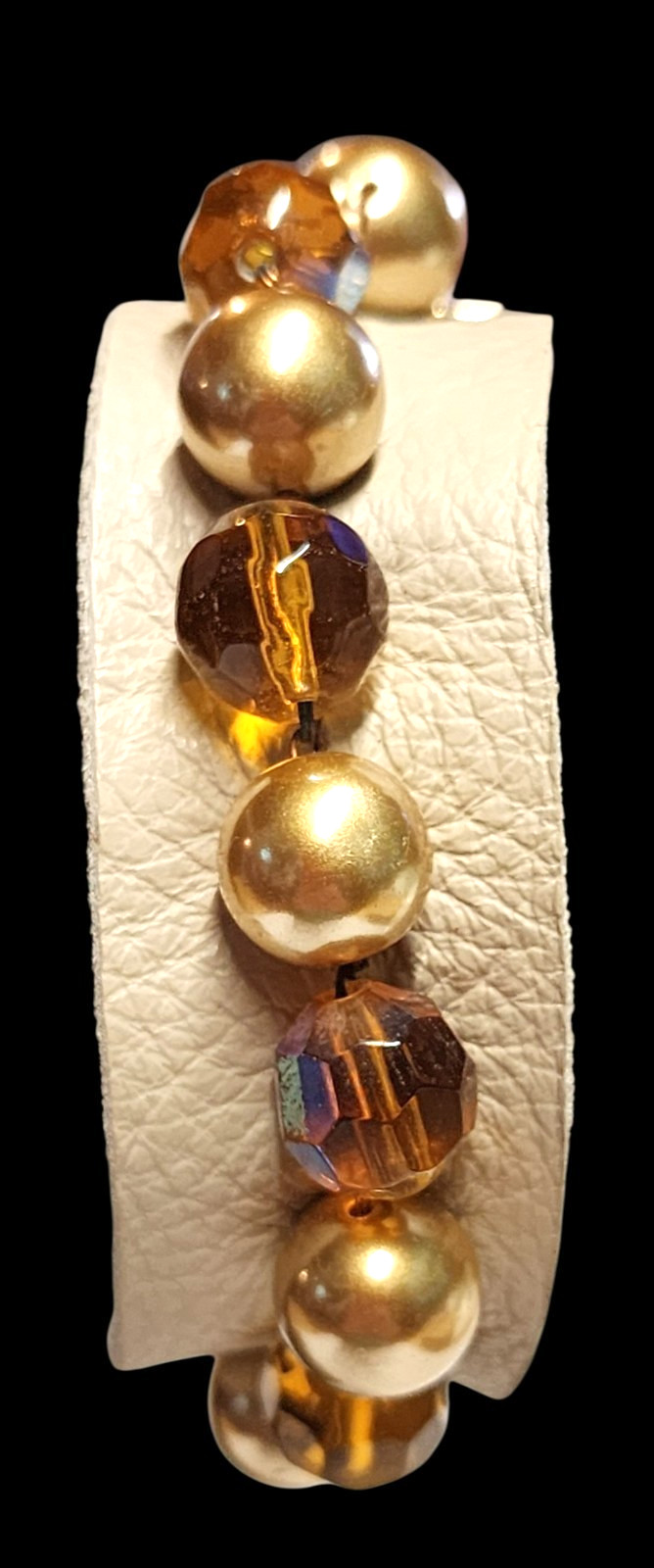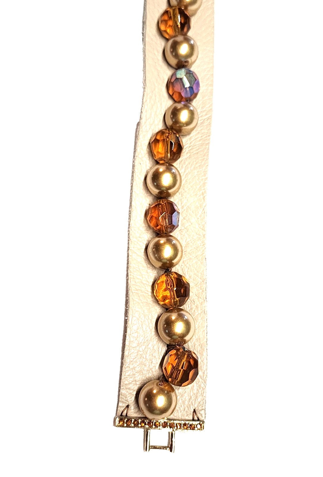 Handmade Orange-Gold Beaded Rhinestone Beige Leather Cuff Bracelet 8 Boho