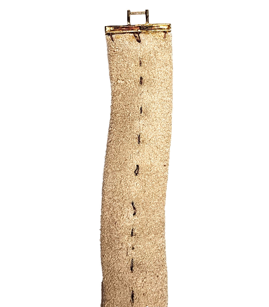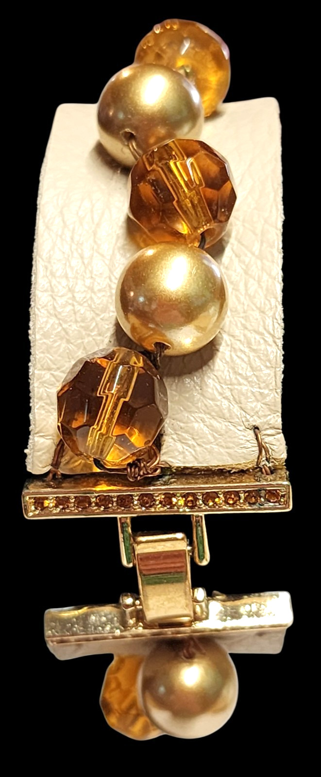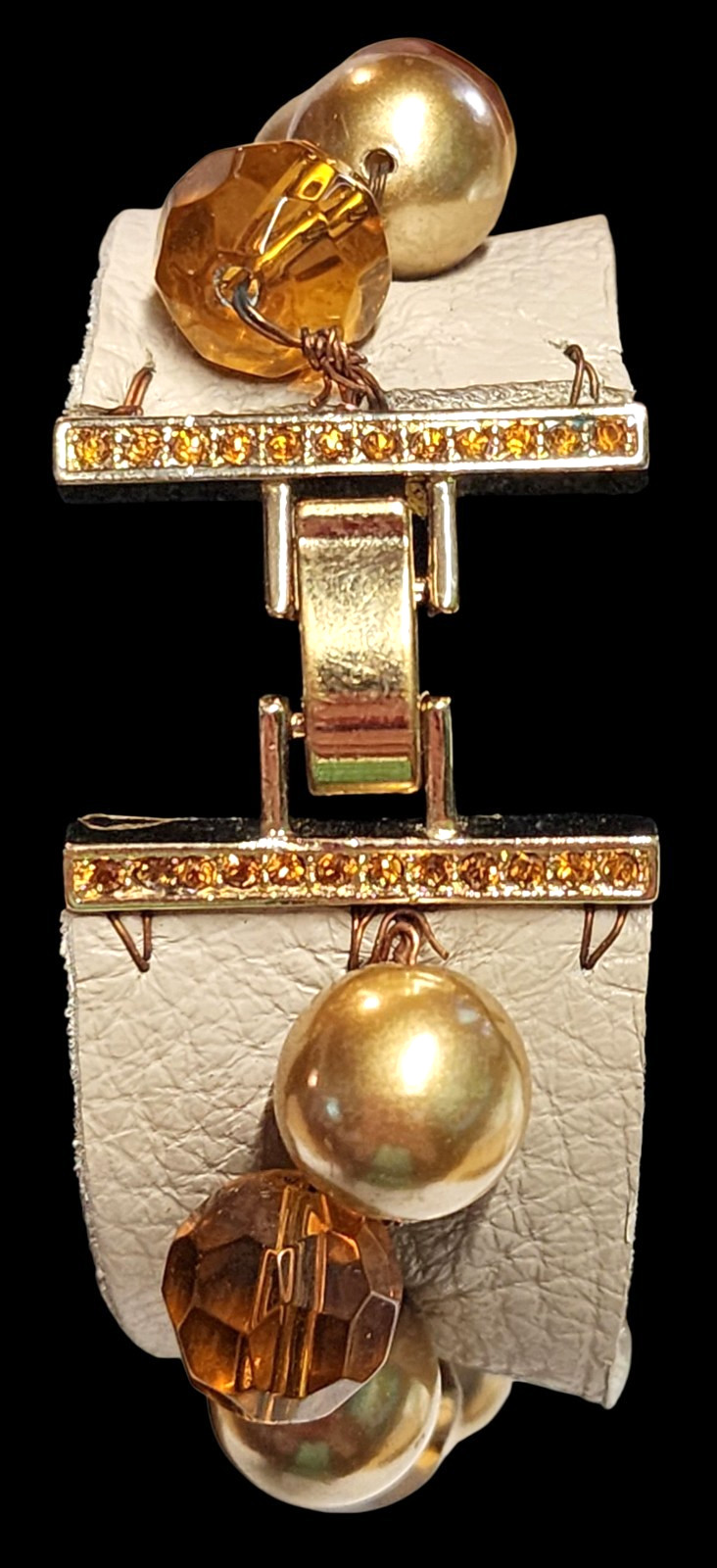Handmade Orange-Gold Beaded Rhinestone Beige Leather Cuff Bracelet 8 Boho