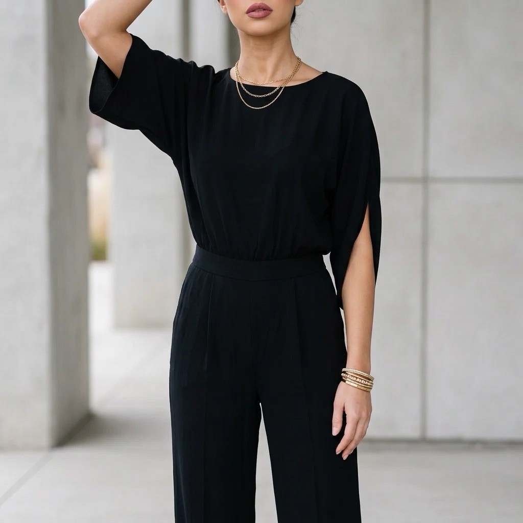 DIANE von FURSTENBERG Black Wide-Leg Jumpsuit Size 8 Boat Neck Batwing Sleeve
