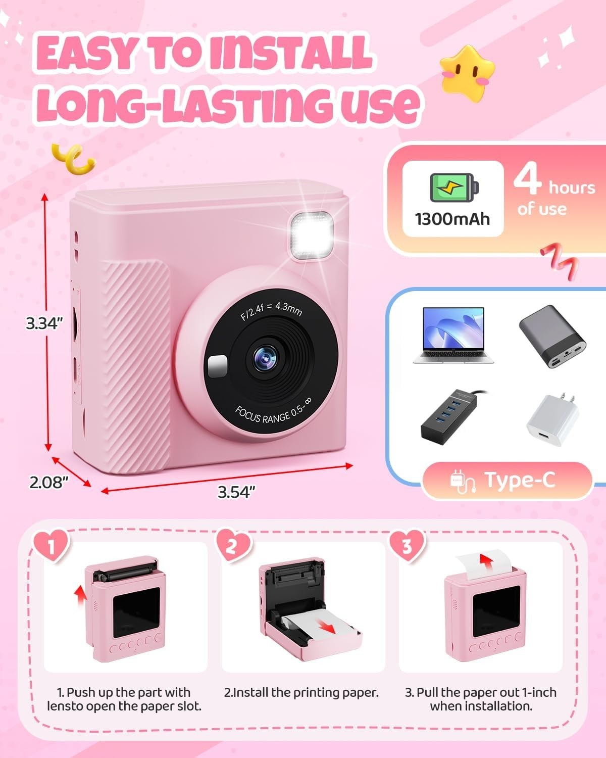 Kids Instant Print Camera, Christmas Birthday Gifts for Girls and Boys, 1080P HD