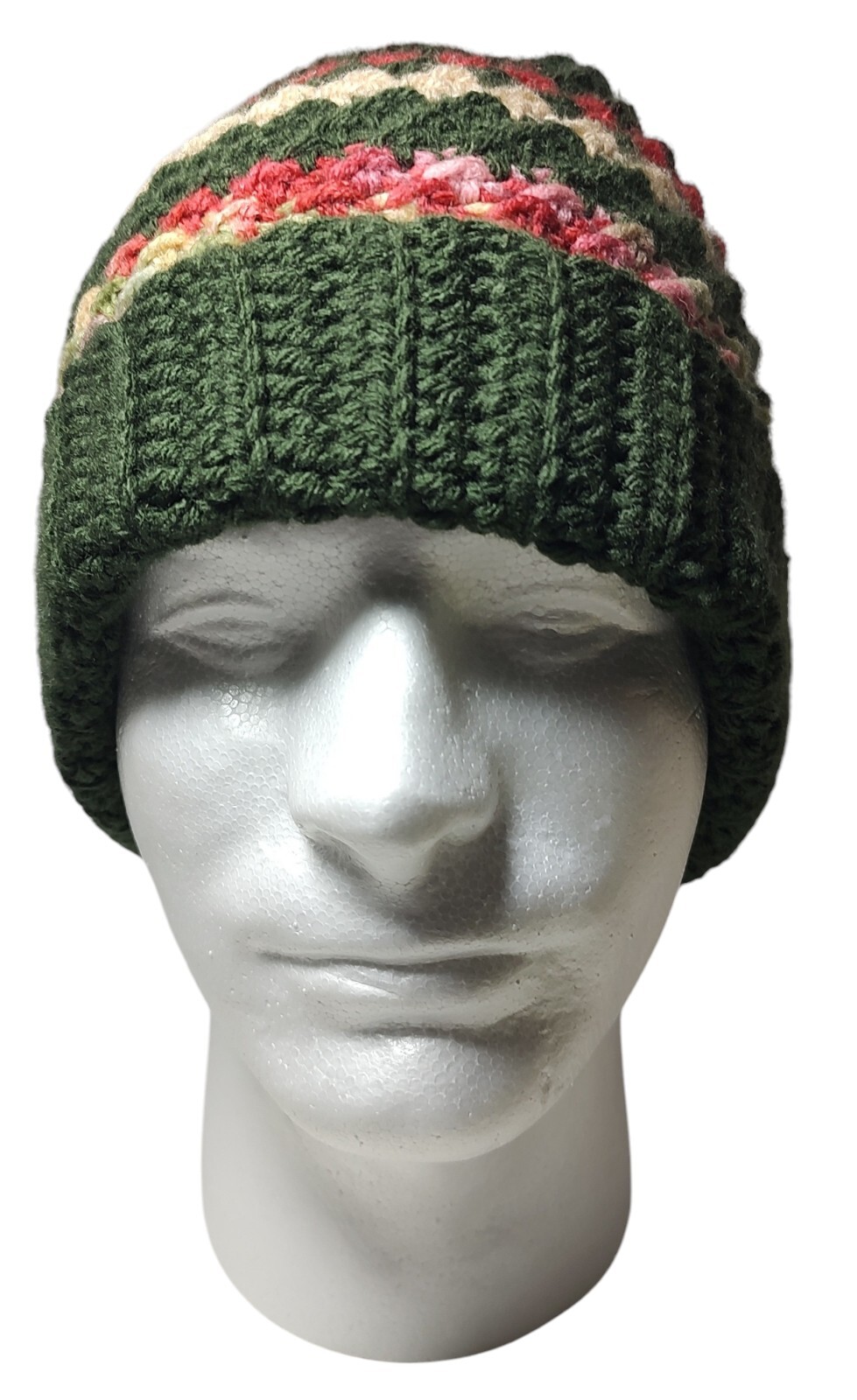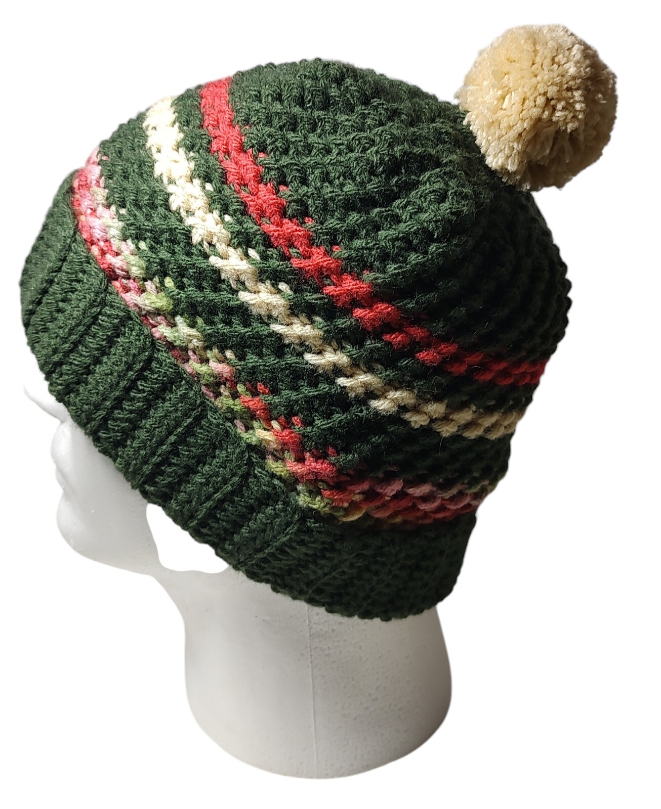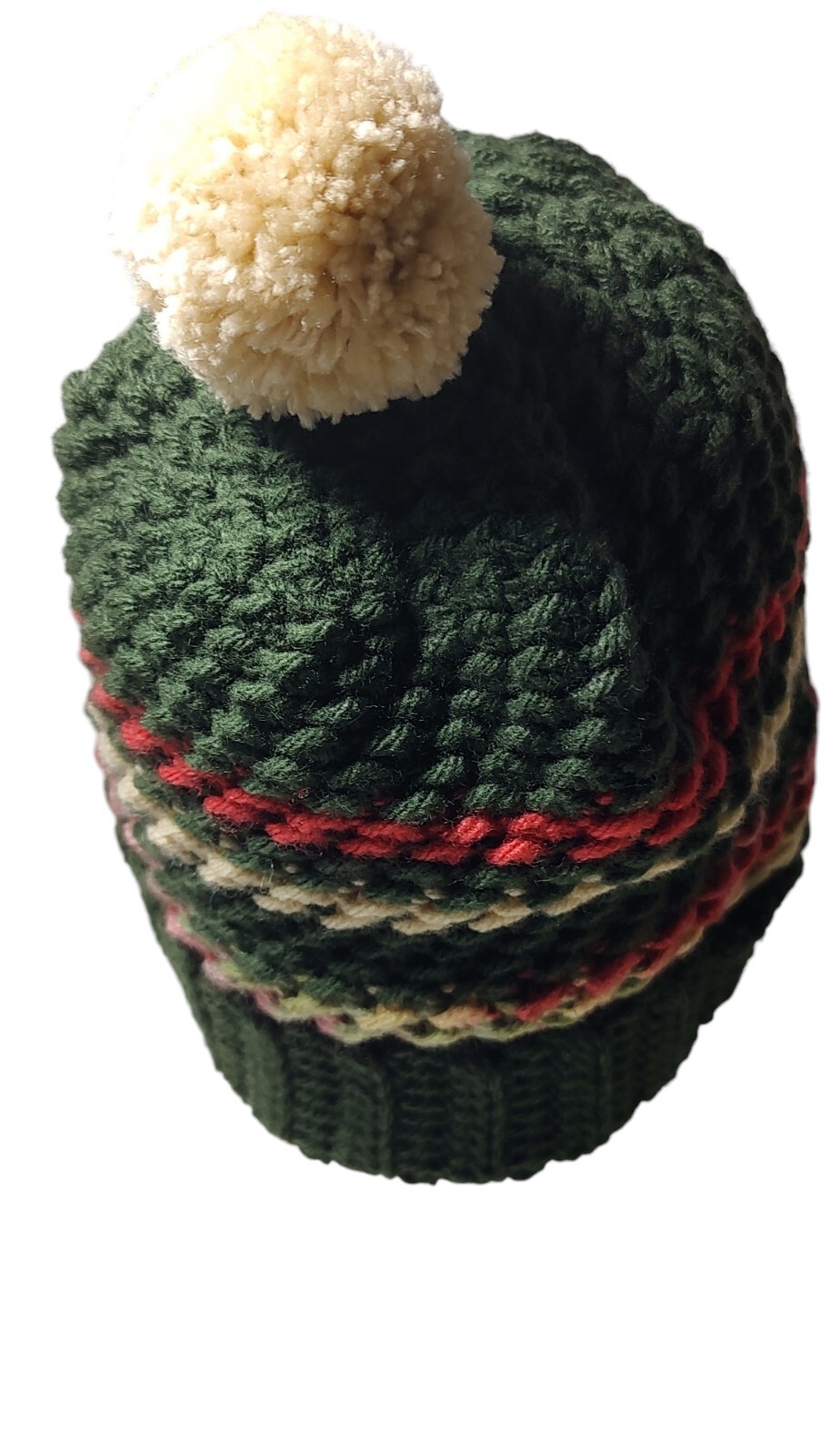 New Hand Knitted Beanie Hat Pom Pom Brim Green Red Pink Winter Unisex Handmade