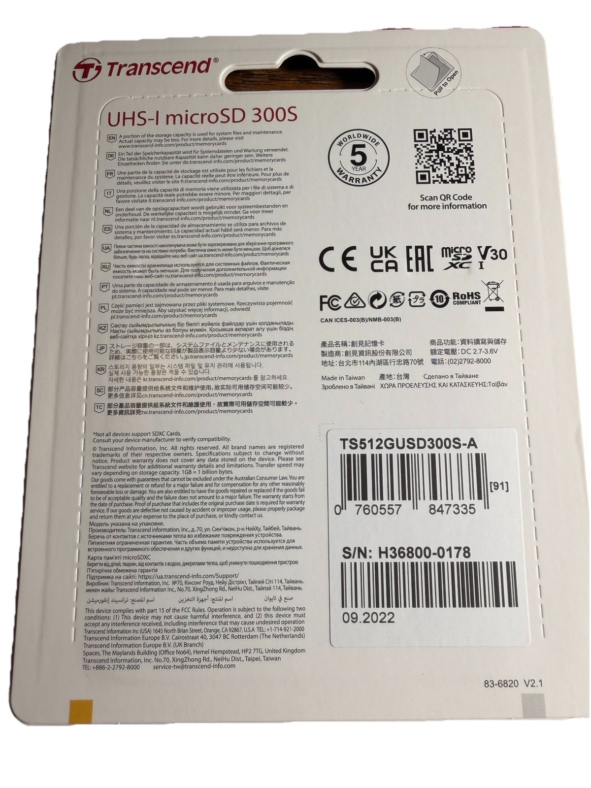 Transcend UHS-I microSD 300S 512GB High Speed Memory Card Class 10 Adapter