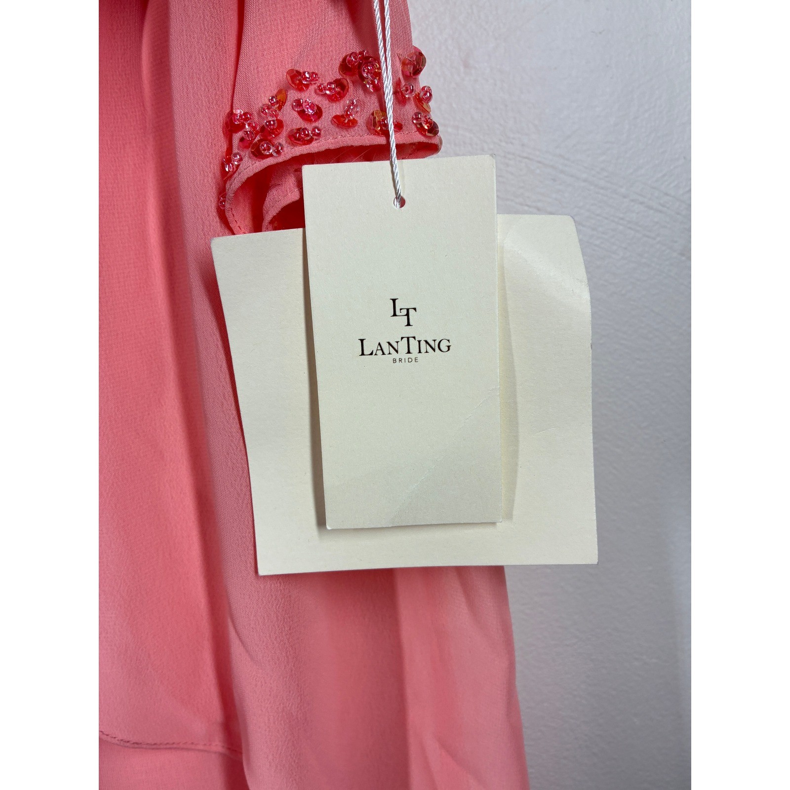 как выглядит Lanting Beaded Sleeve Chiffon Overlay Sheath Dress Medium Peach Mother of Bride фото
