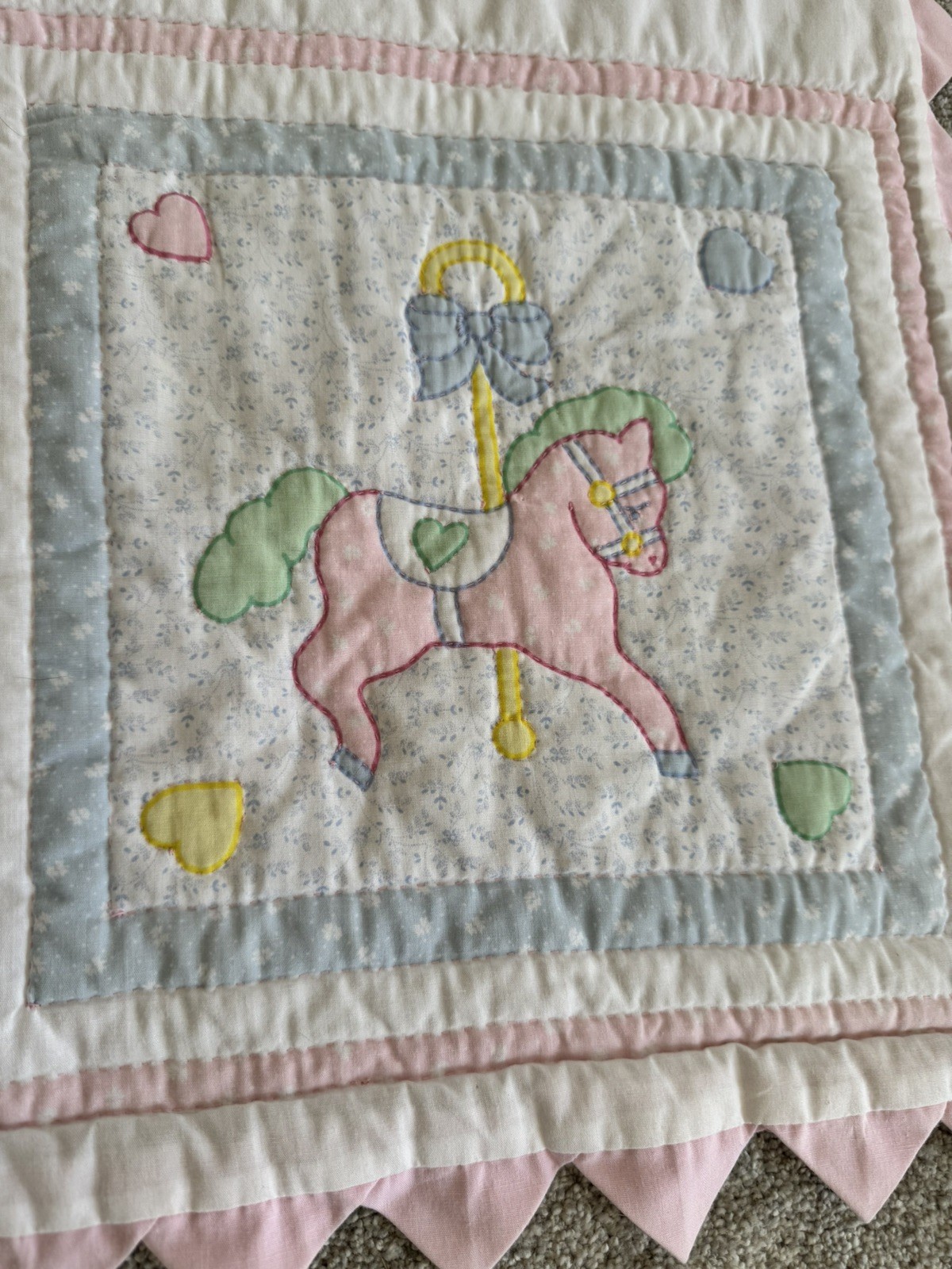 VTG Handcrafted Baby Crib Quilt Nursery Animals Pastels Pink Back 58x44 READ