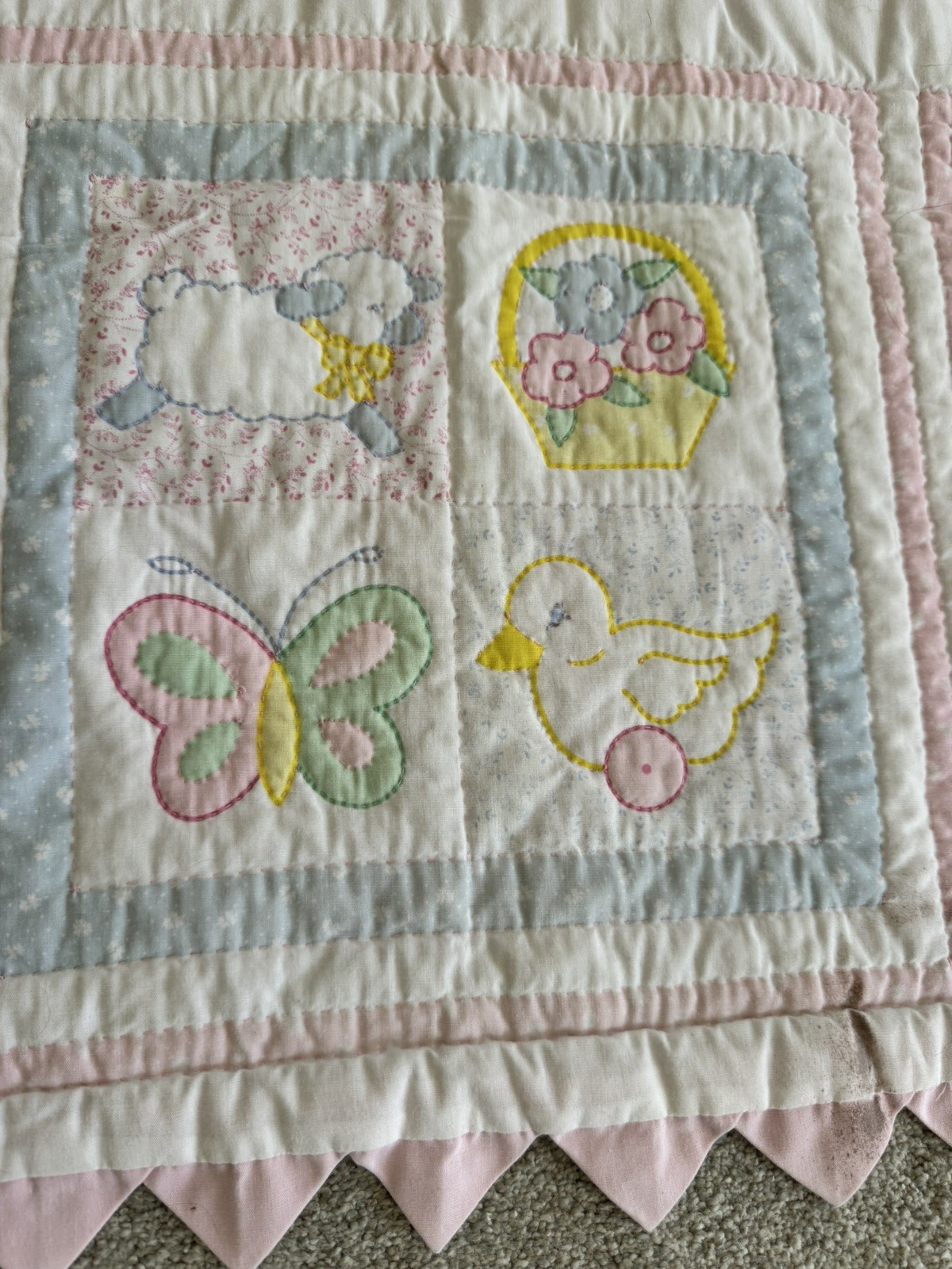 как выглядит VTG Handcrafted Baby Crib Quilt Nursery Animals Pastels Pink Back 58x44 READ фото
