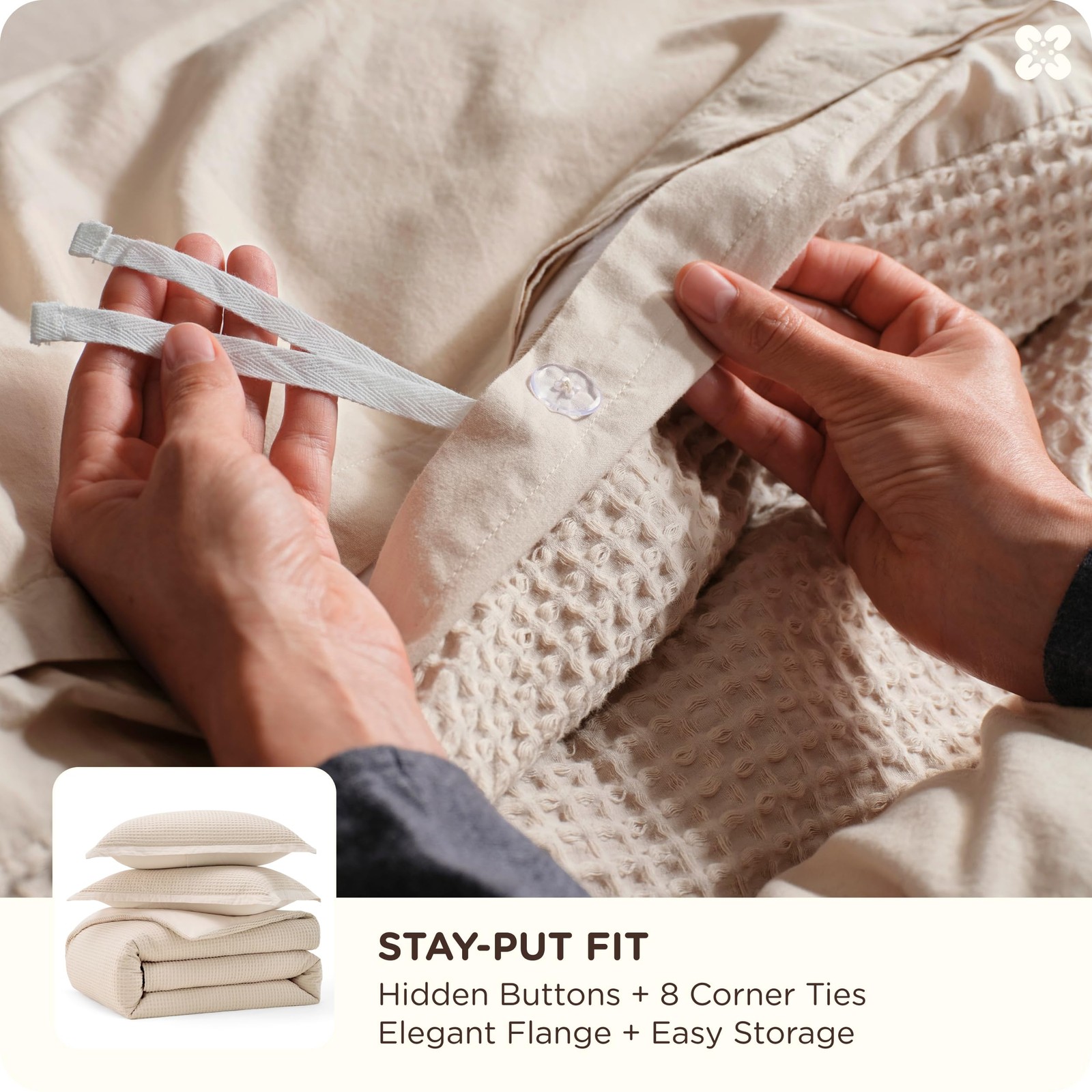 как выглядит Duvet Cover Queen Size 100 Cotton Waffle Weave 3 Pieces Beige Bedsure Bedding фото