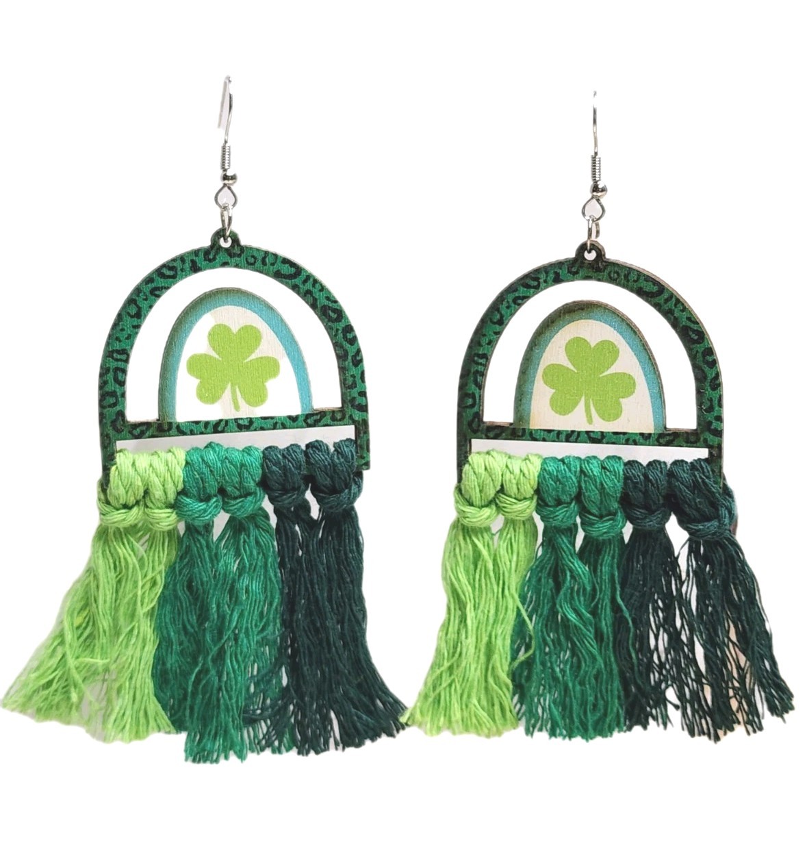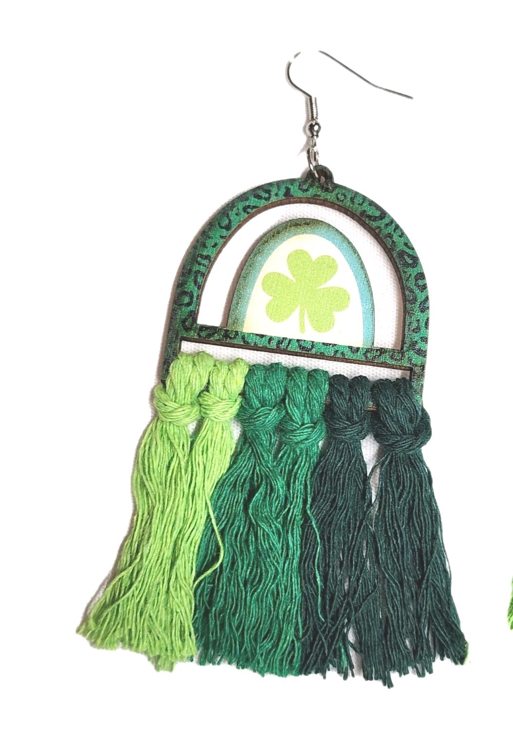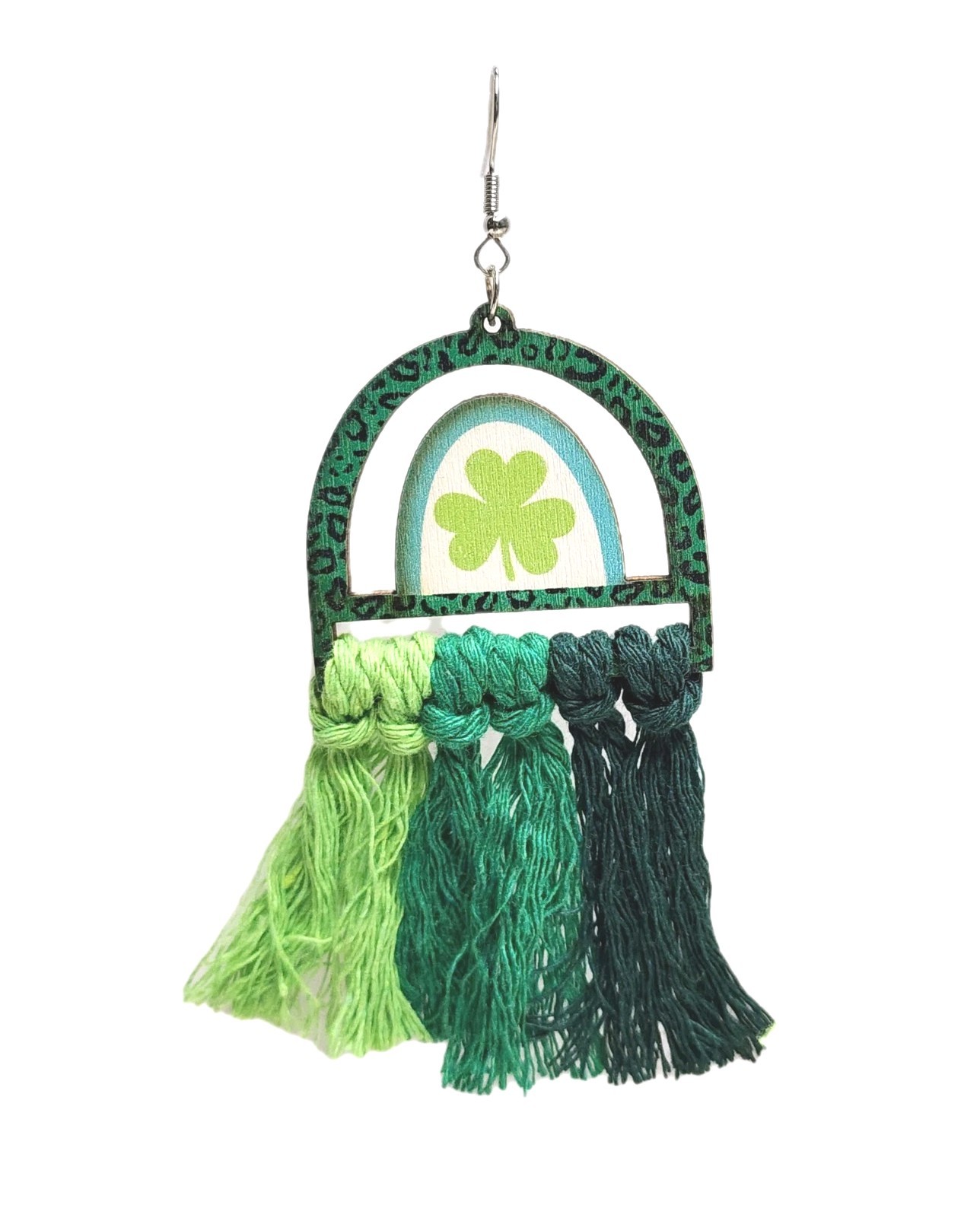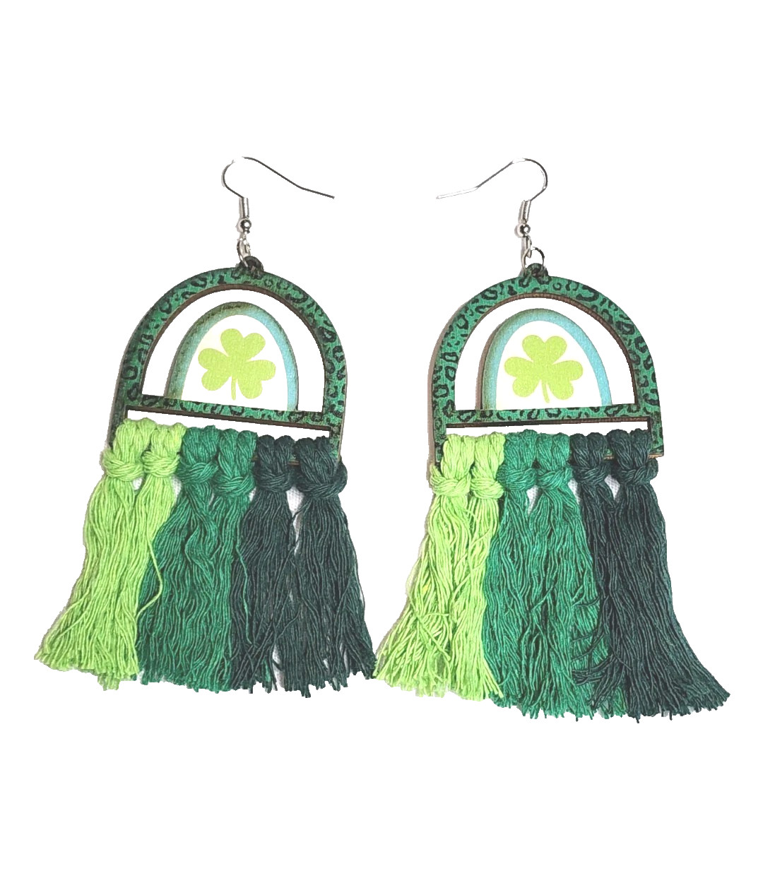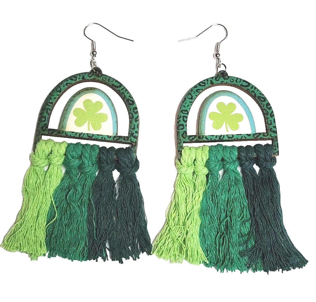 New Green Shamrock Wood Cat Print Tassel St. Patrick's Day Earrings Statement