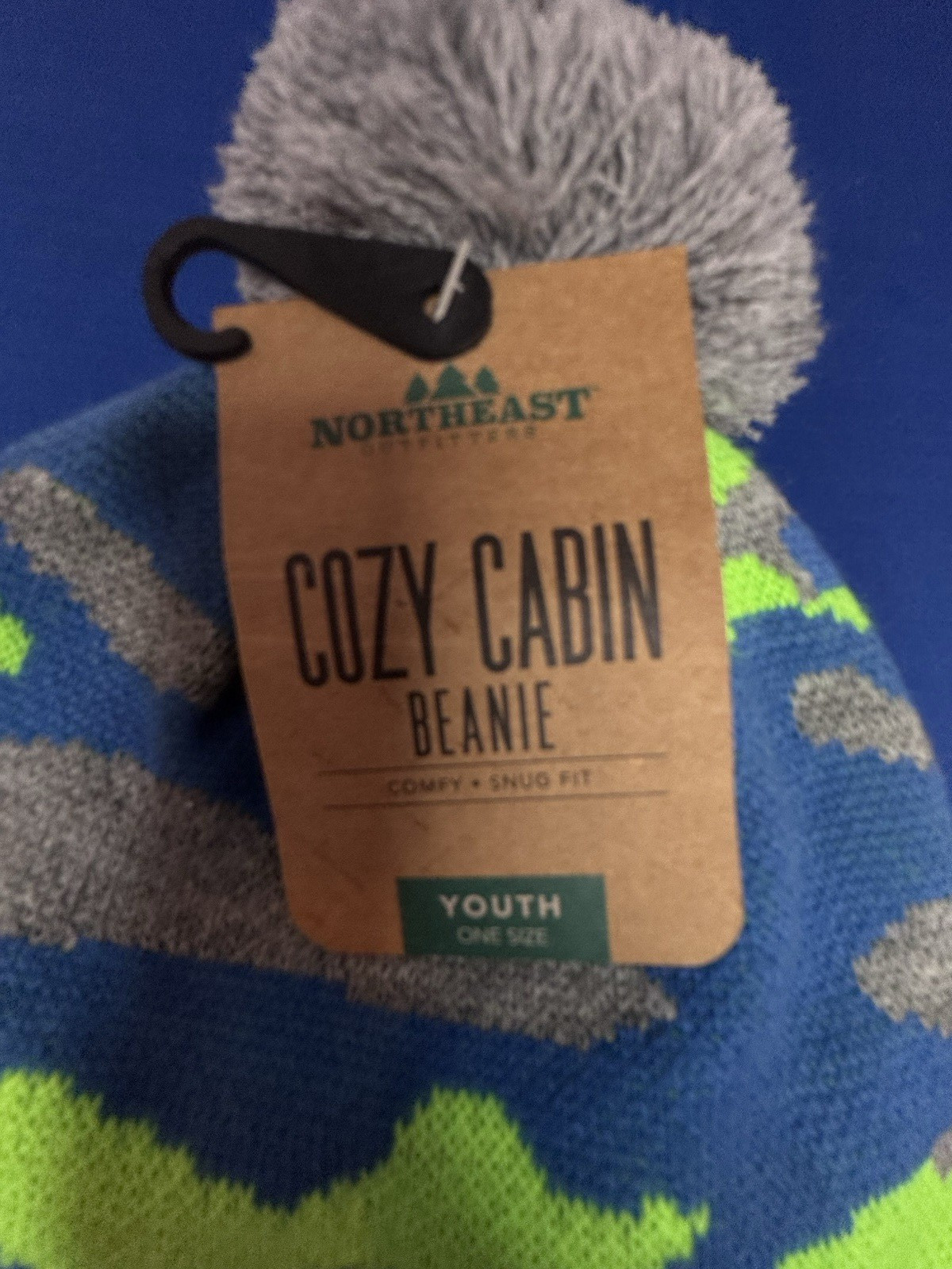 Northeast Outfitters Cozy Cabin Beanie Youth Blue Gray Pom Winter Hat Fleece D14
