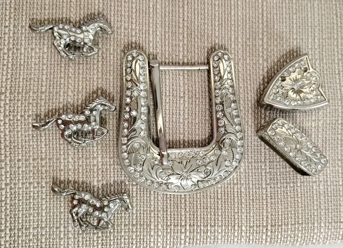 Silver Tone Women's Belt Buckle Set Horses Rhinestones Cowgirl Western