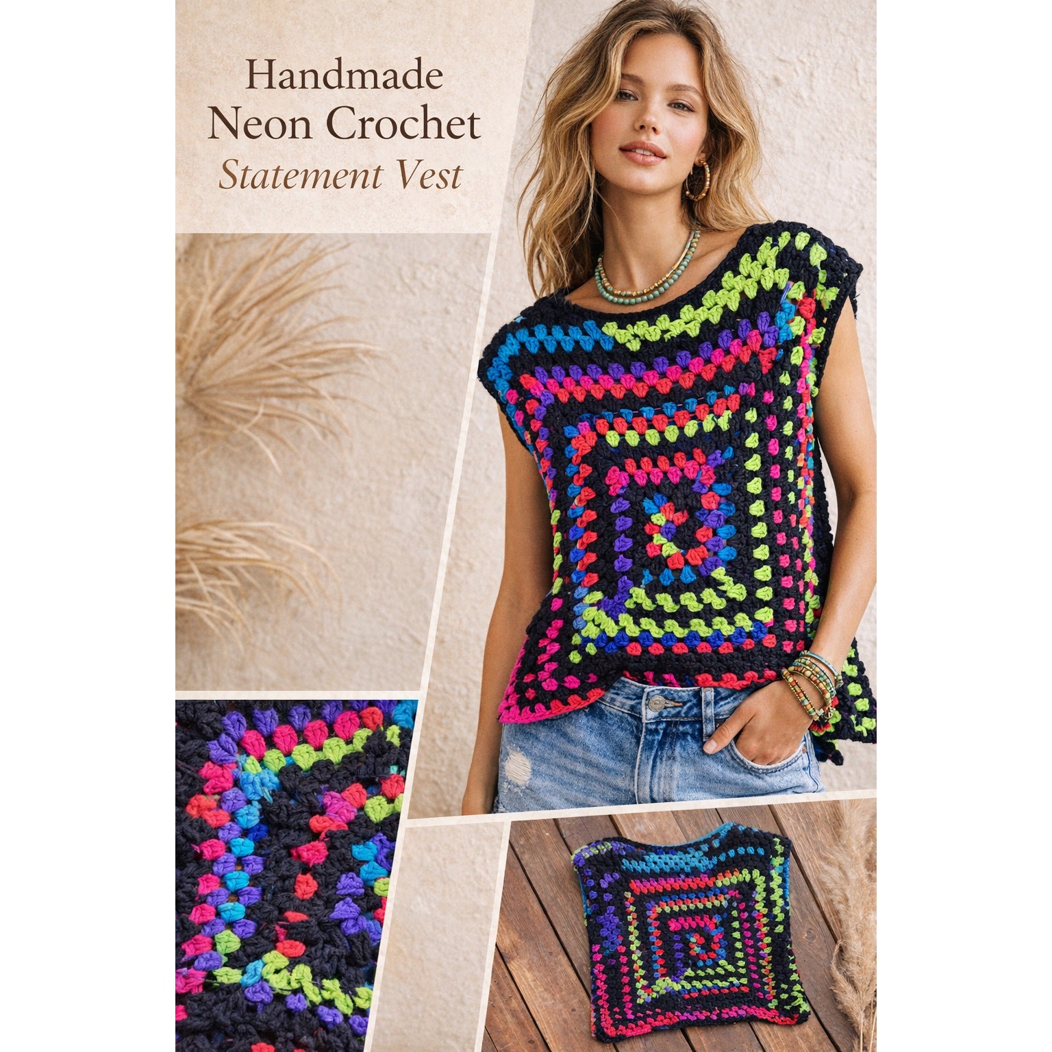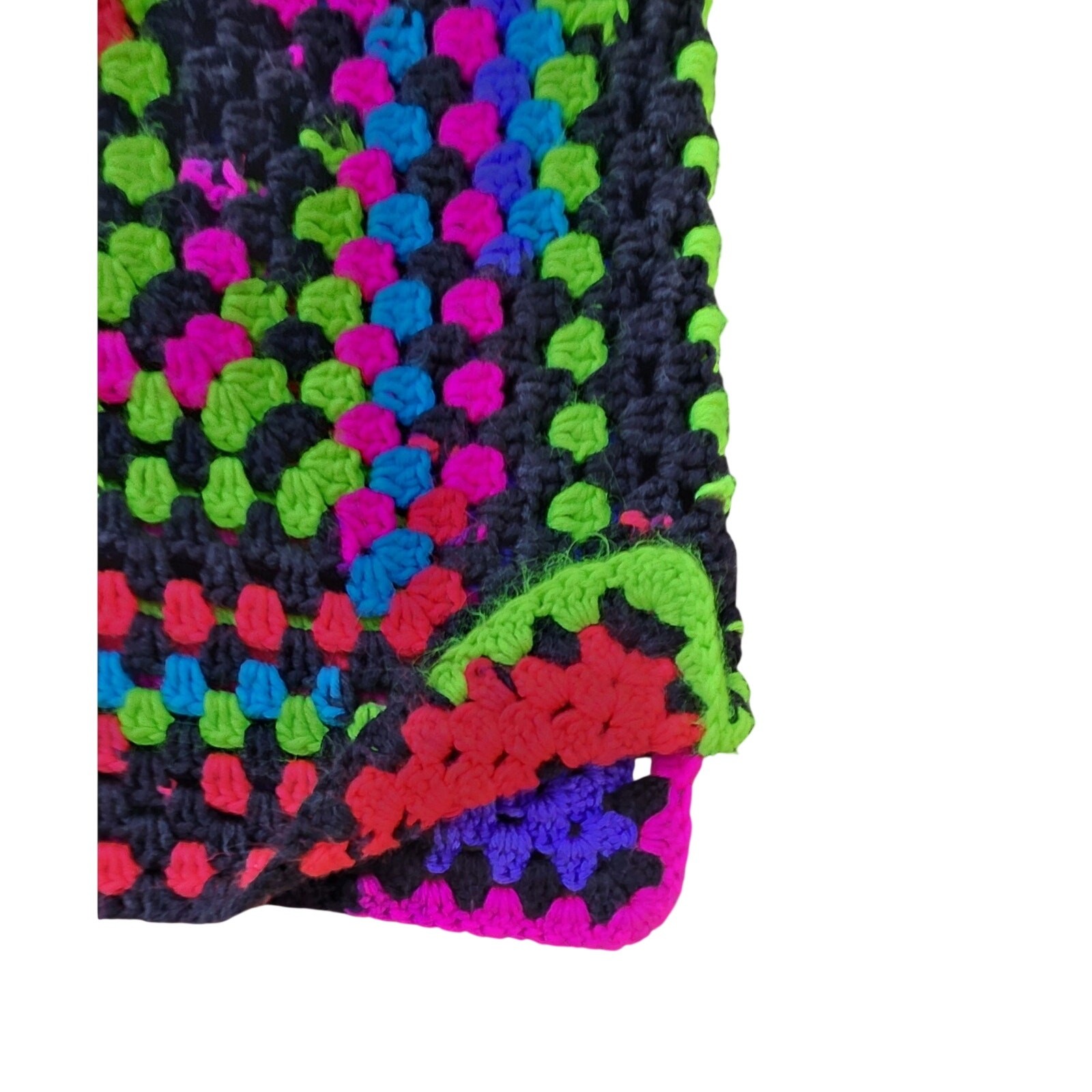 Hand Crochet Granny Square Vest Neon Boho Festival Top Oversized One Size