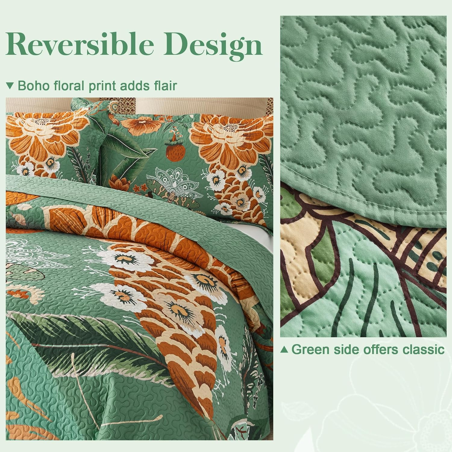3 Piece Sage Green Boho Floral King Size Quilt Sets Farmhouse Botanical Reversib