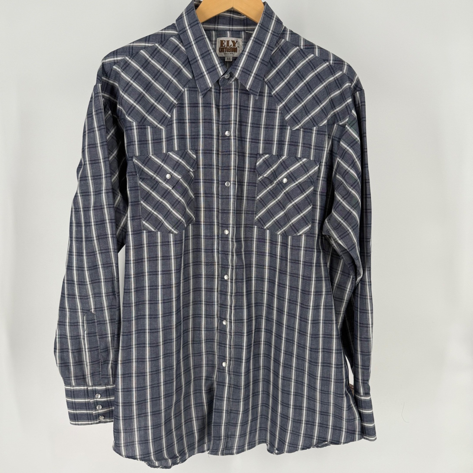 Ely Cattleman Mens XL Plaid Pearl Snap Western L/S Shirt Blue White VTG Cowboy