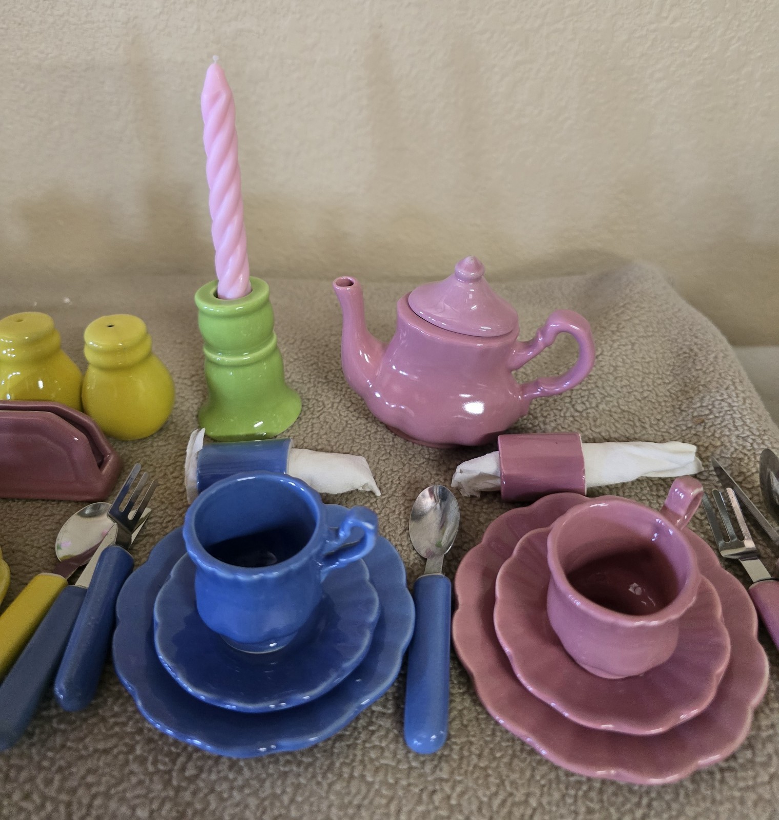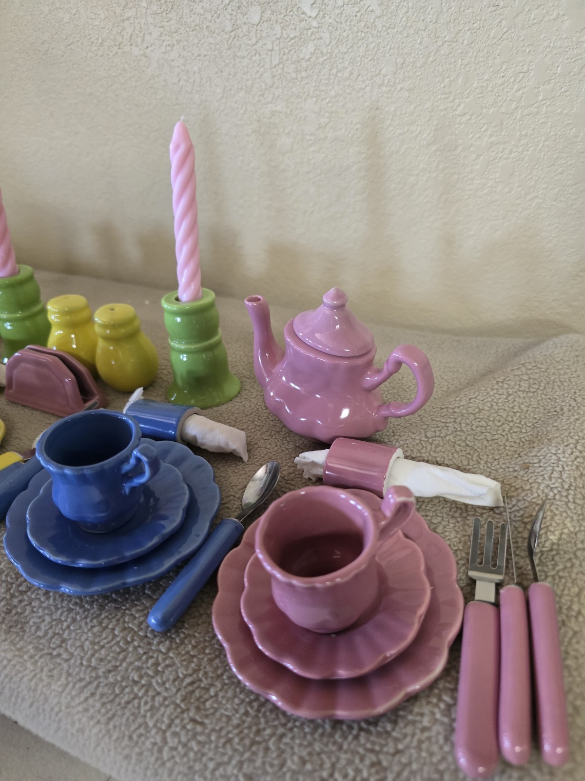 Vtg Frenzy Toys Fiesta Style Pastel Ceramic Childs Doll Tea Set 44 Pieces FLAW
