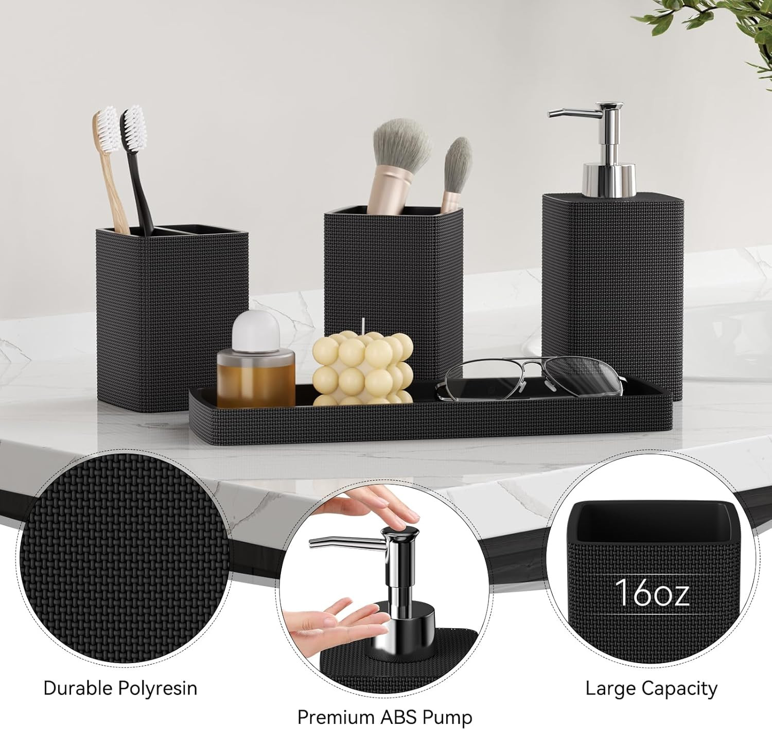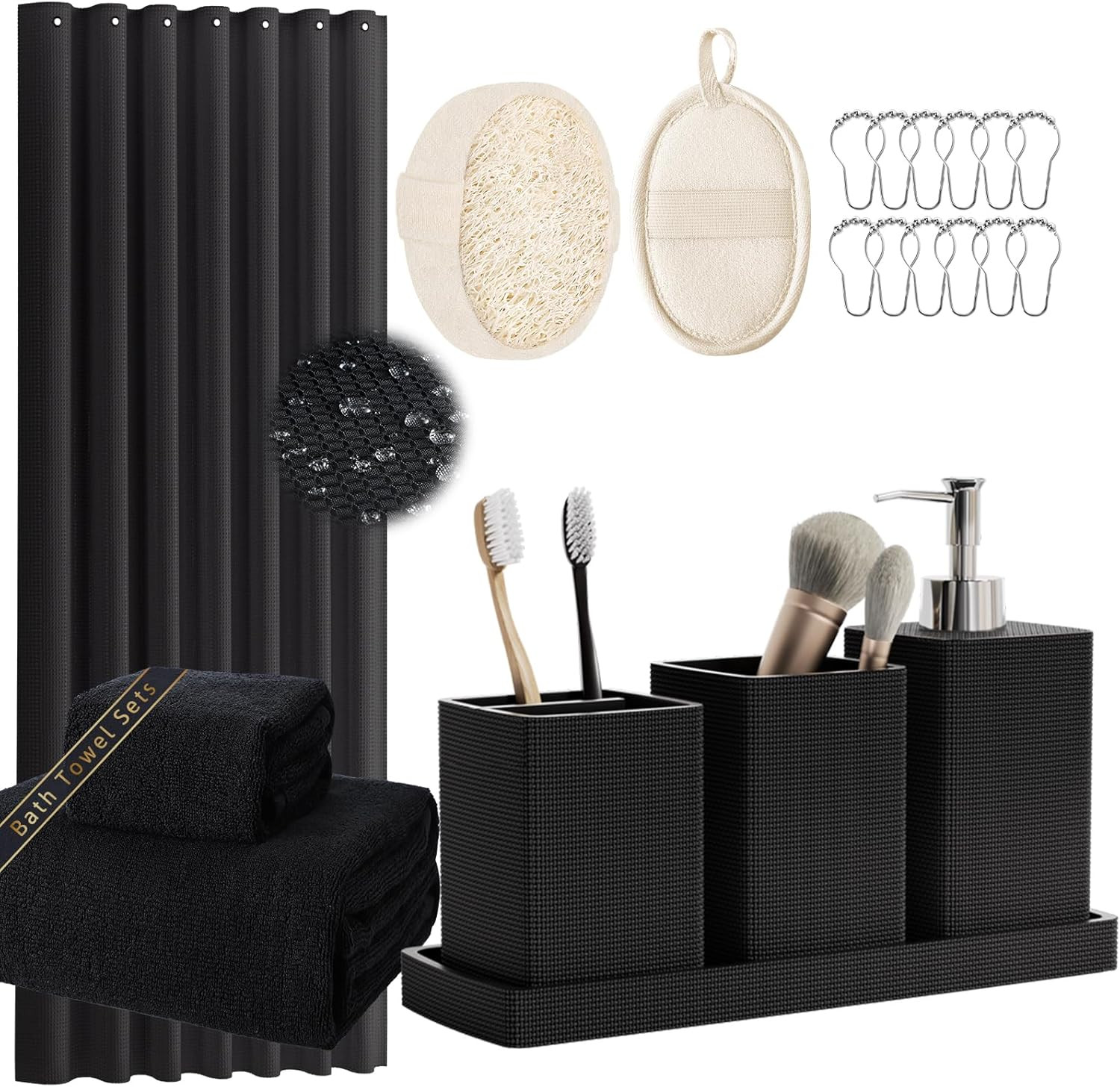 Resin Black Bathroom Sets, Black Bathroom Accessories Set with Shower Curtain, B