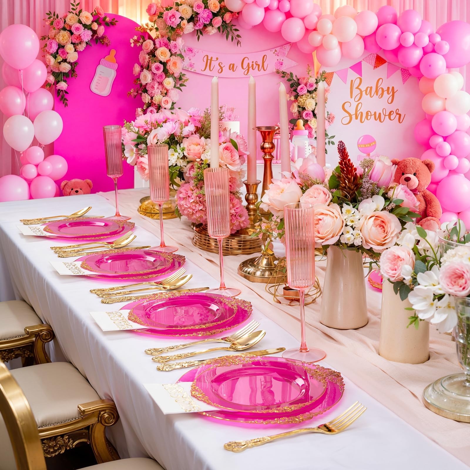 102PCS Clear Hot Pink Plastic Plates - Pink Disposable Plate with Gold Rim - ...