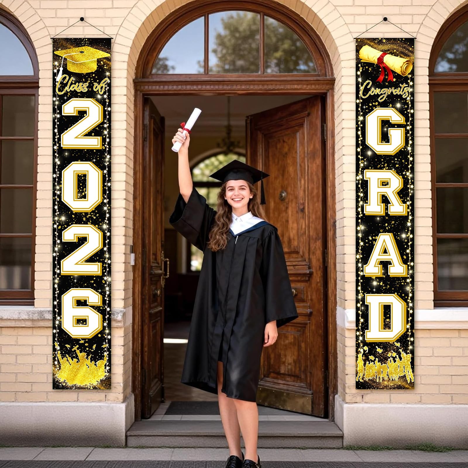 Black Gold Graduation Decorations Class of 2026 Congrats GRAD Porch Sign Banner