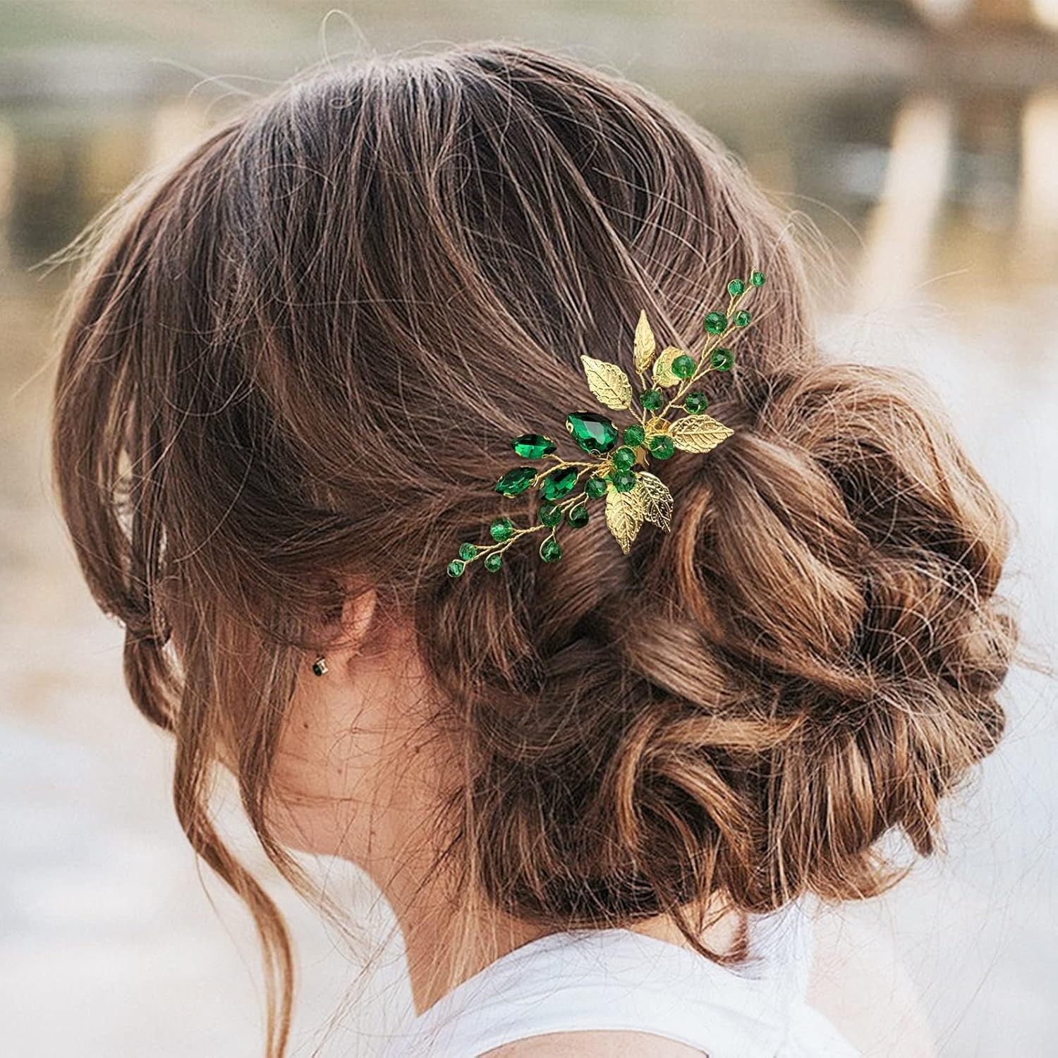 Bridal Hair Comb Emerald Green Crystal Gold Leaf Vine Hair Piece Accessories for