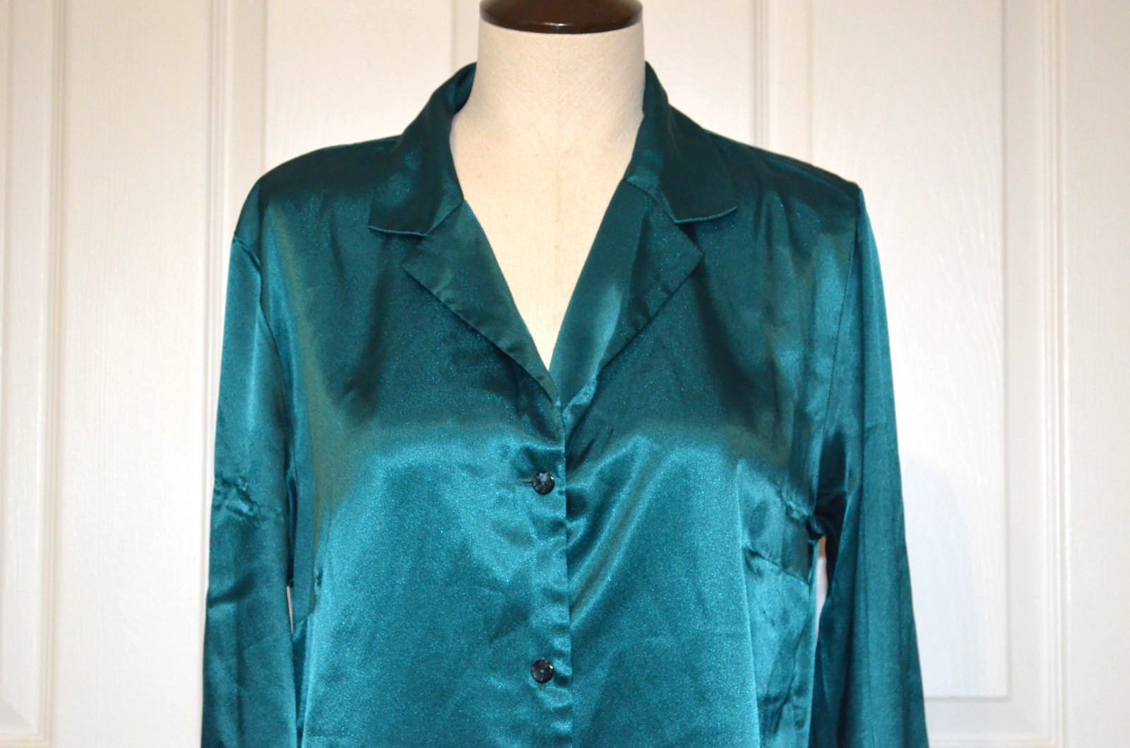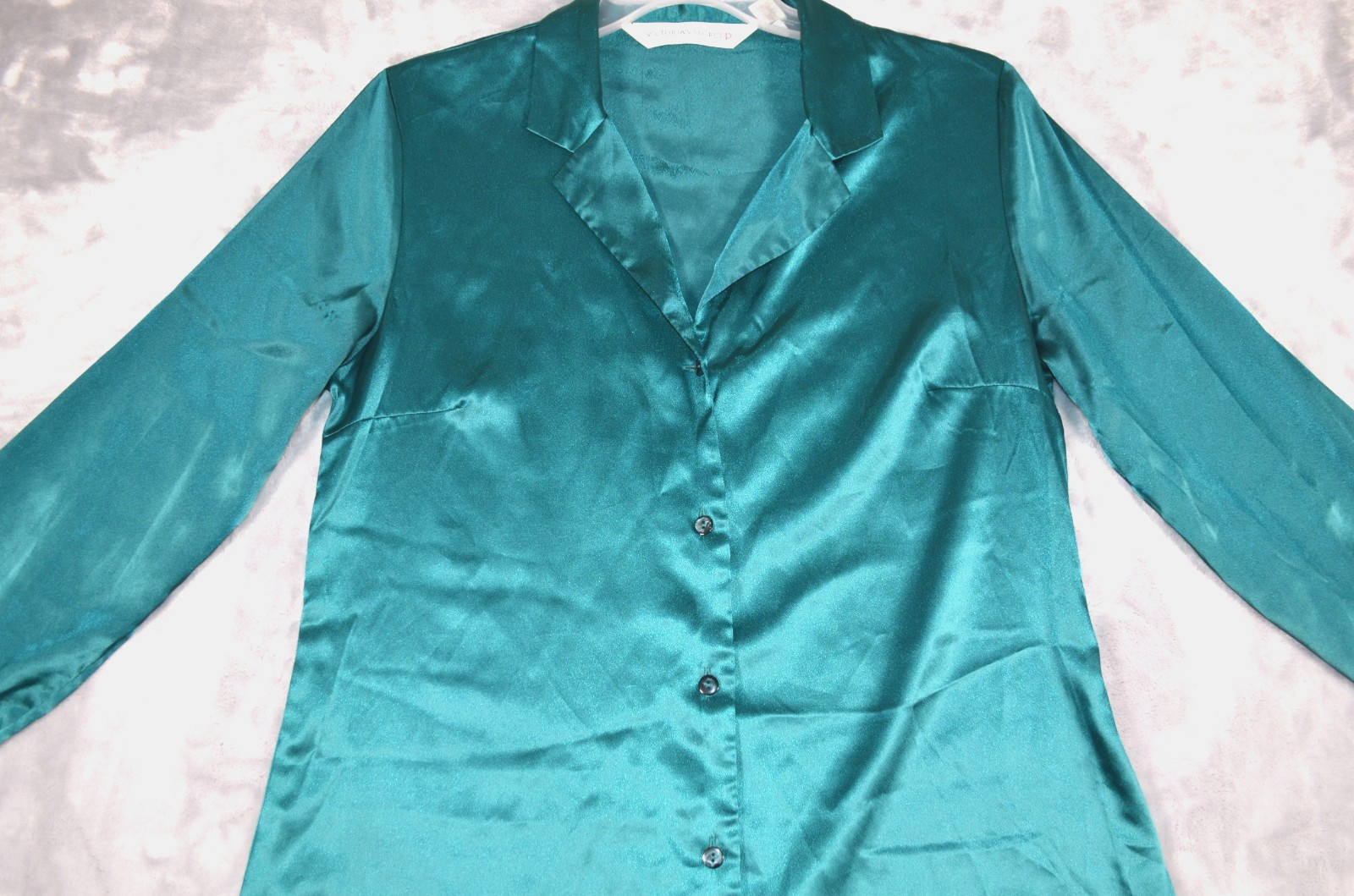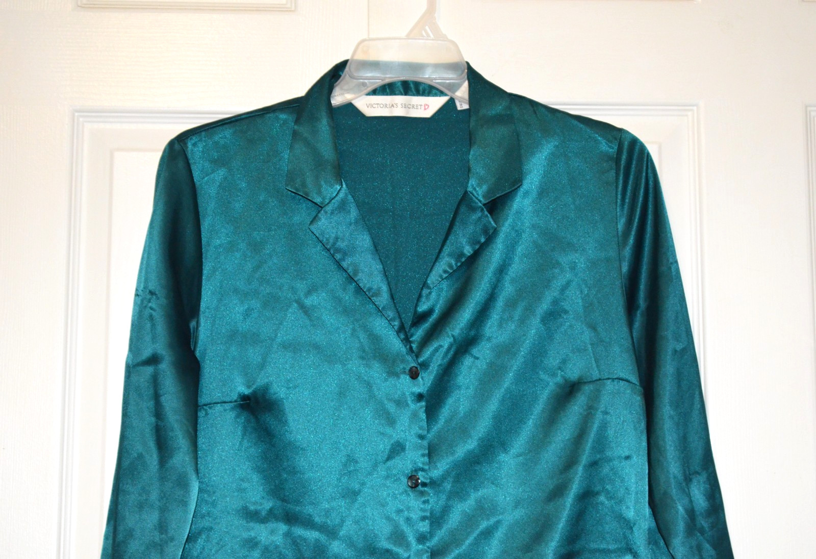 Victoria s Secret Green Satin Pajama Night Shirt Womens Size M Button Front