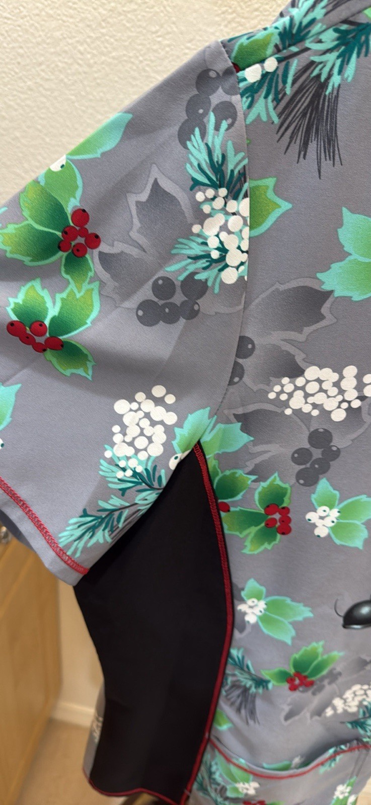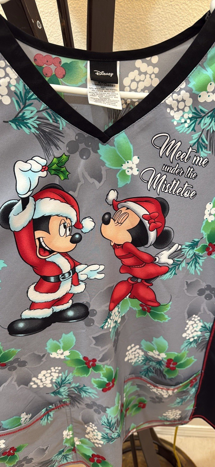 Disney Holiday Scrub Top Gray Patterned Mickey Minnie Mouse Recycled Polyester