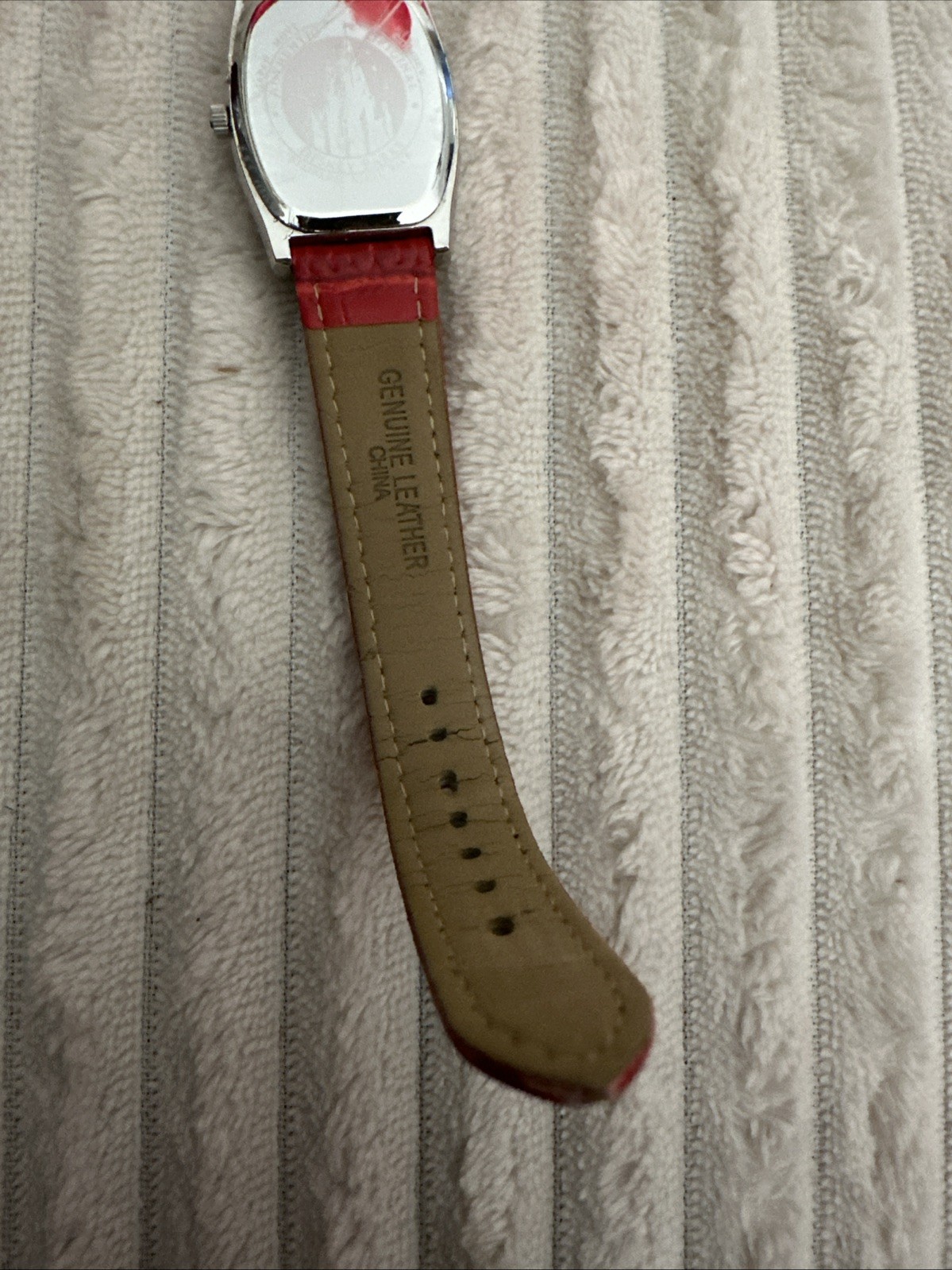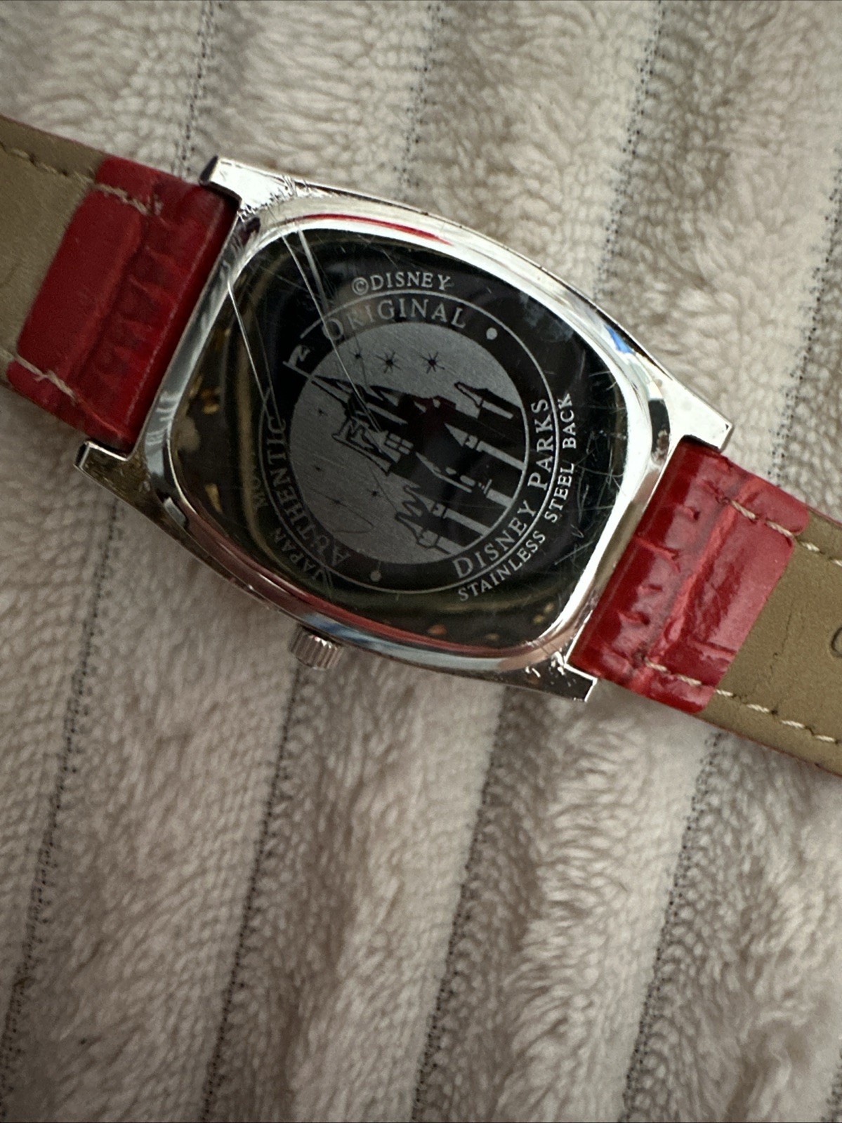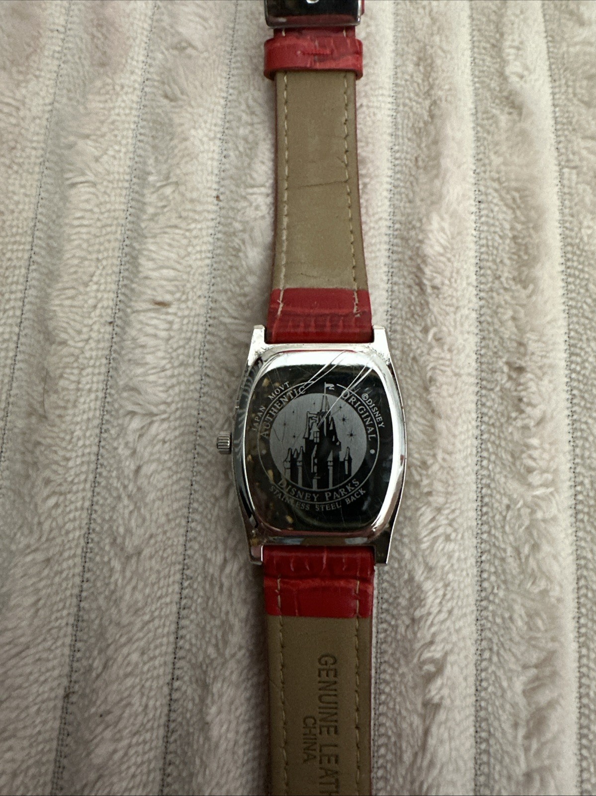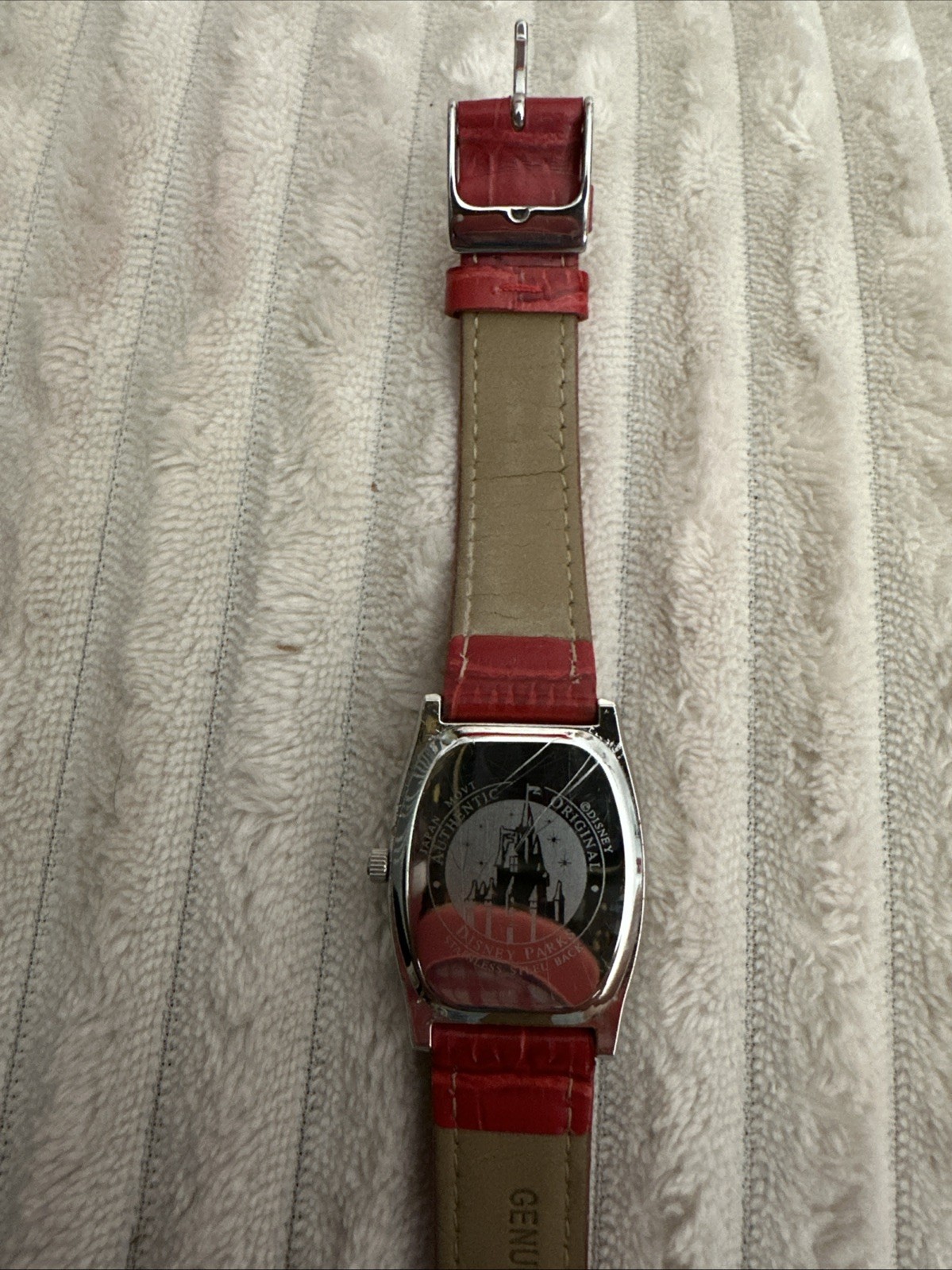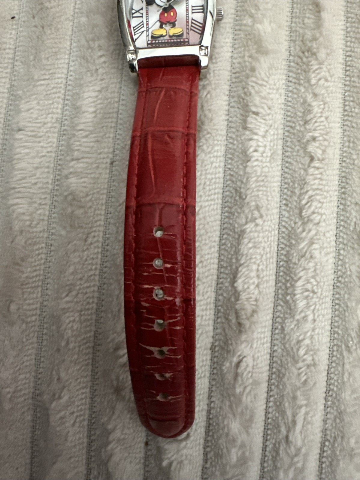 как выглядит DISNEY PARKS MICKEY MOUSE WATCH RECTANGLE ROMAN NUMERALS, RED LEATHER BAND WORKS фото
