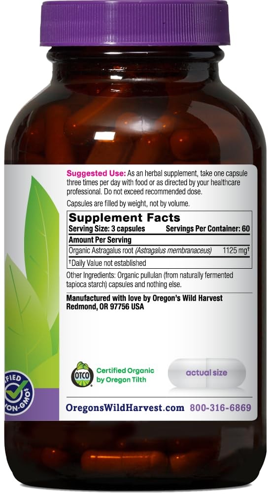 Organic Astragalus Capsules 180 Count Oregons Wild Harvest Non-GMO Certified