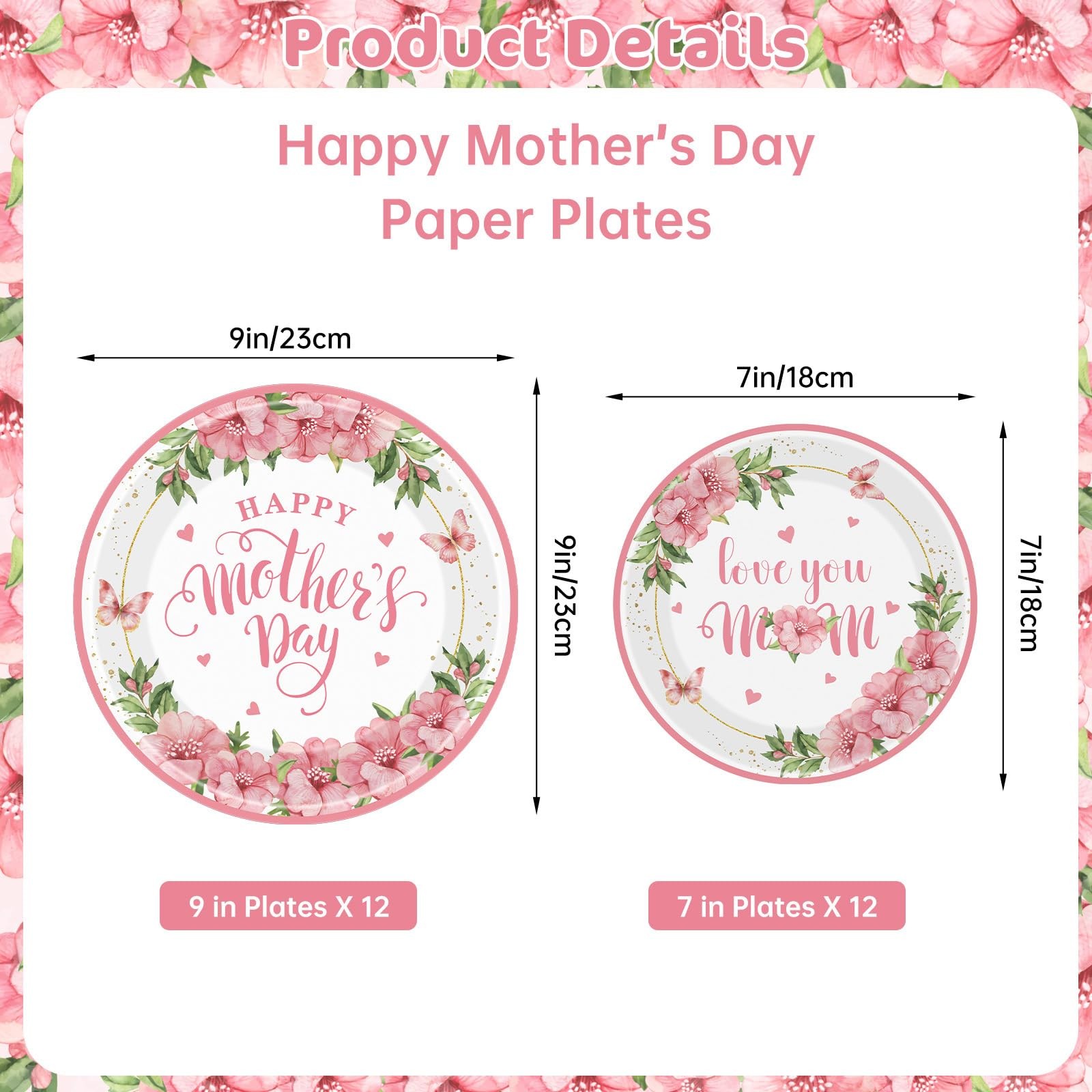 24 Pcs Happy Mother's Day Plates Set - Pink Love You 9 inches, 7