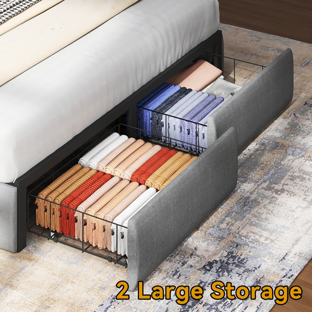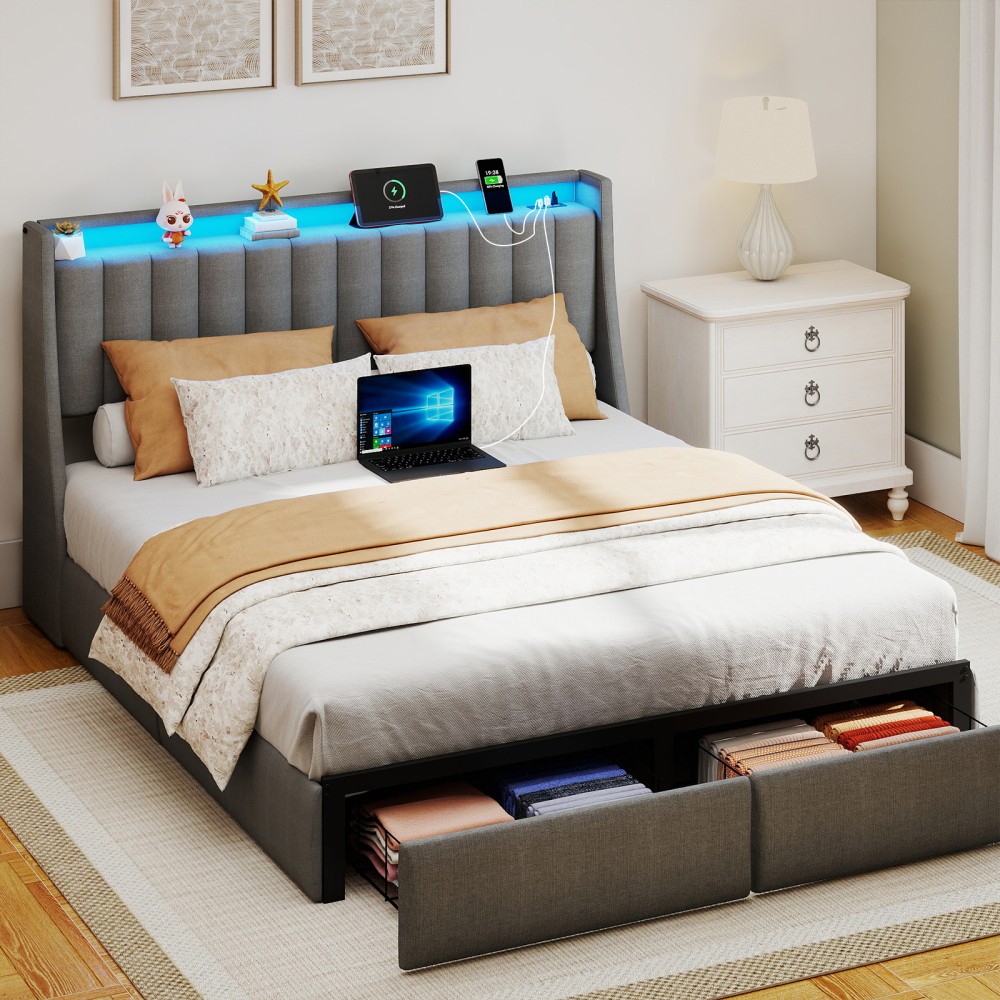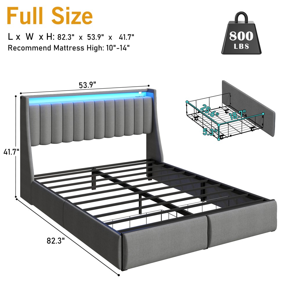 Full Queen Upholstered Storage Bed Frame with LED Lights and Charging Station